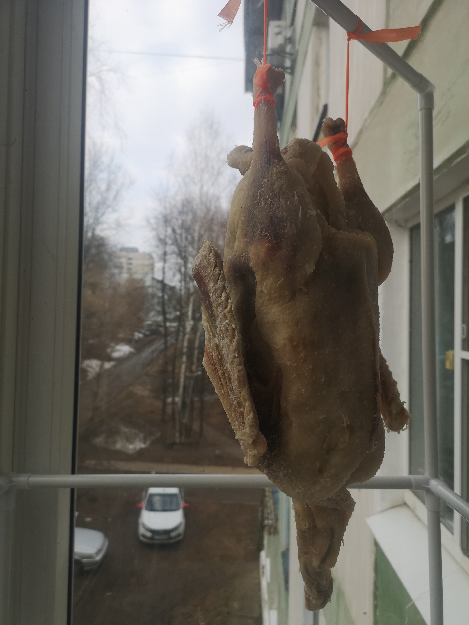 A whole, raw chicken hangs upside down by its feet from a white PVC pipe frame on a balcony. The chicken's feet are tied with orange plastic ribbons. The balcony overlooks a courtyard with bare trees…read more
