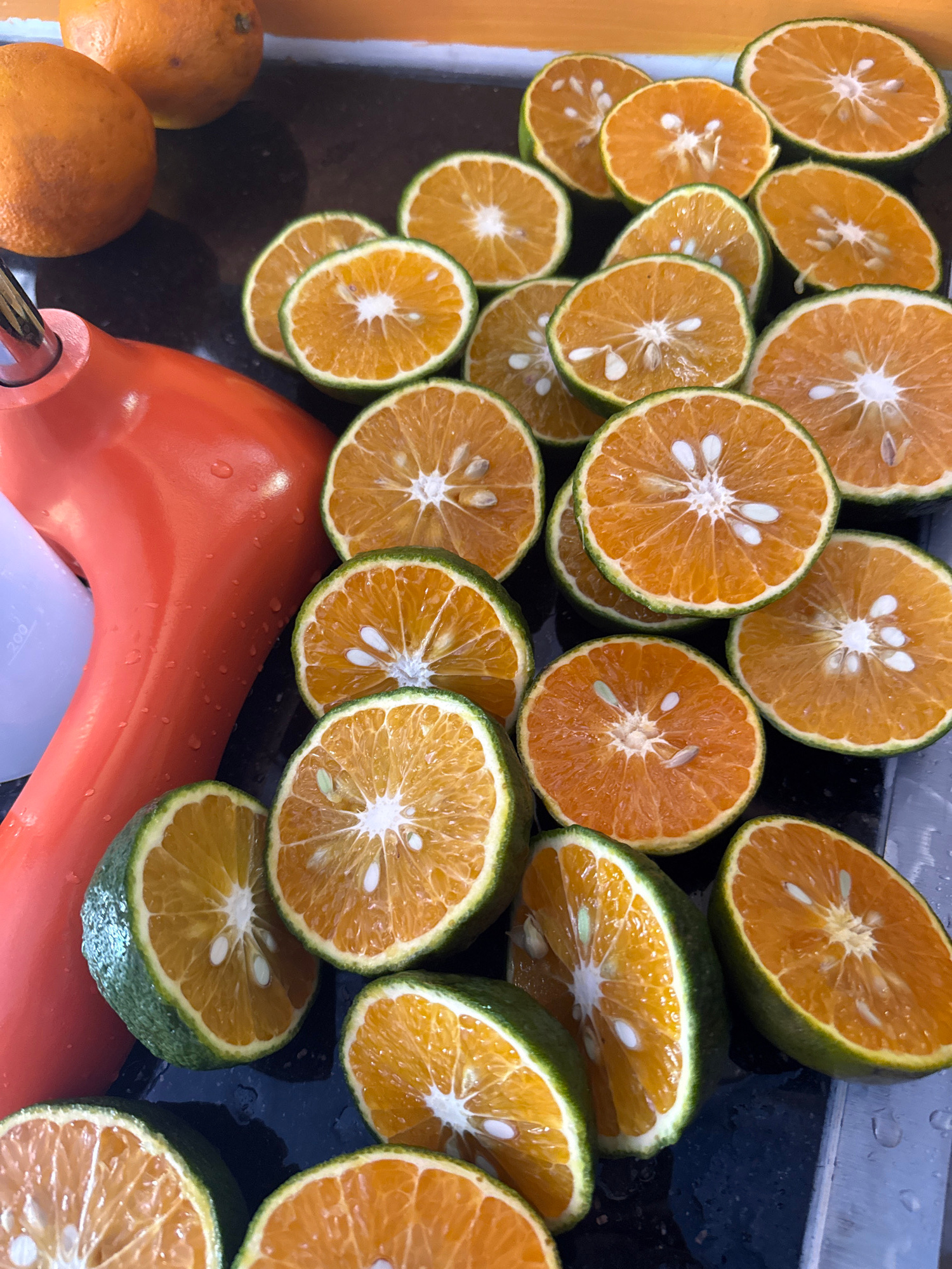 The image depicts a collection of sliced oranges, likely tangerines or a similar citrus fruit, arranged on a dark, possibly wet surface. The oranges are cut in half, revealing their pulpy interior, wi…read more