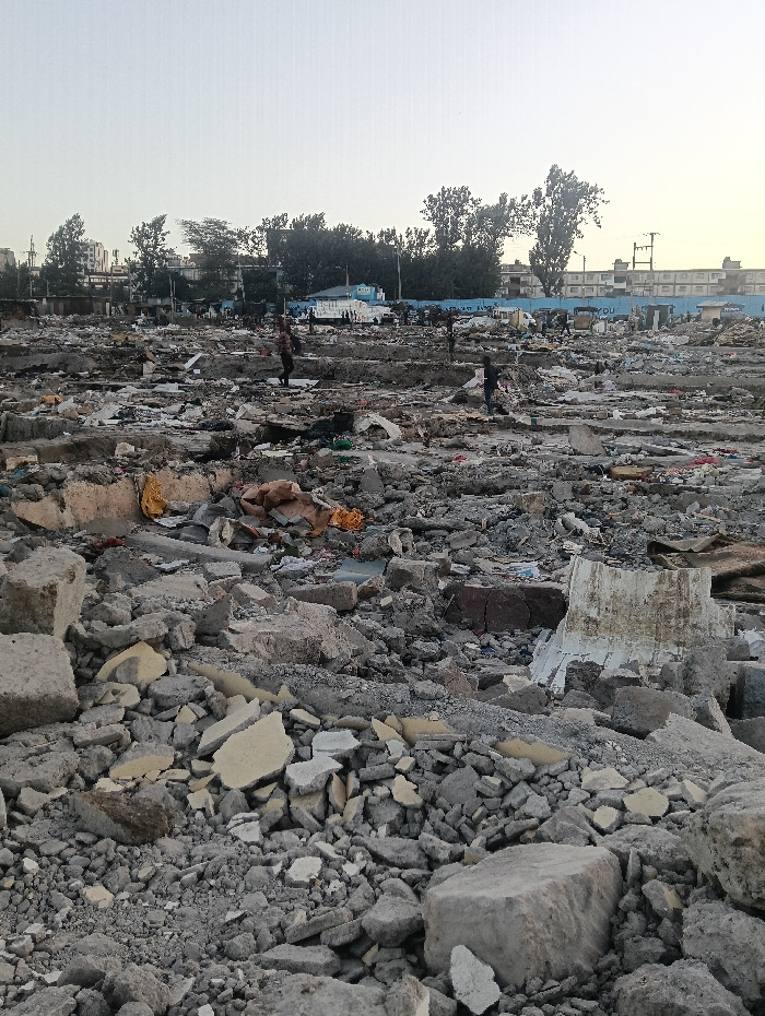 A vast expanse of rubble dominates the scene, filled with fractured concrete, stone fragments, and debris. The sky is overcast. Distant trees and buildings line the horizon. Several figures traverse t…read more