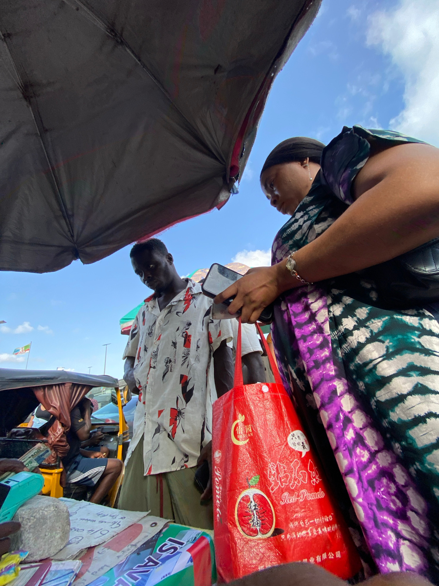 The image, taken from a low angle, depicts a street scene in Lagos, Nigeria. The sky is blue with scattered clouds. In the foreground, a gray umbrella offers shade. Two people are visible: a woman wea…read more