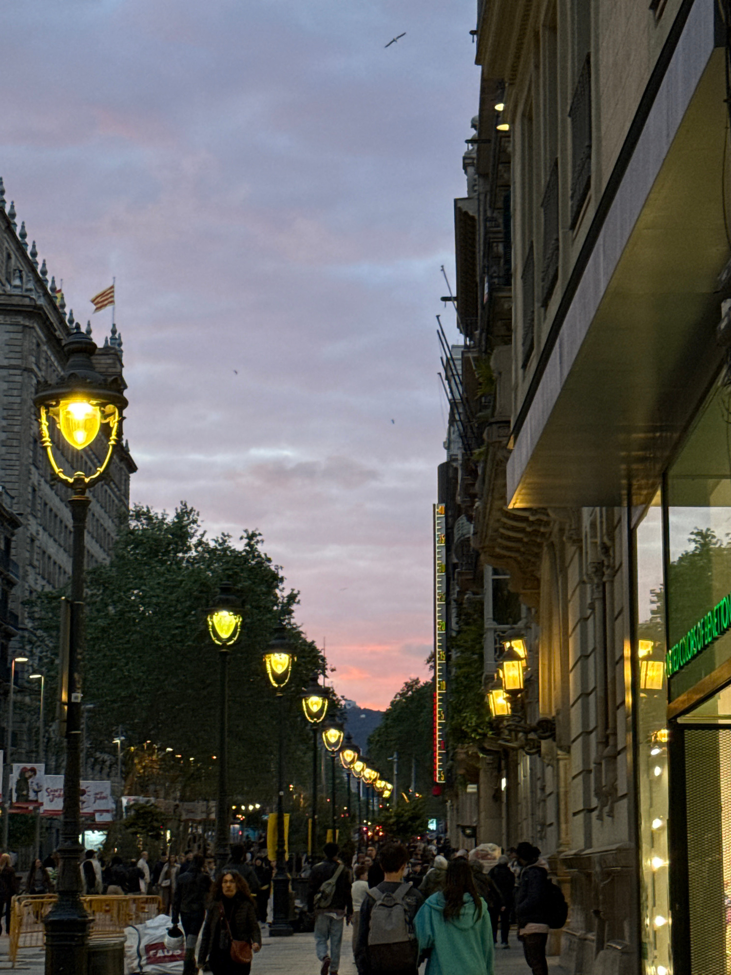 This image shows a street in Barcelona, Spain at twilight. The street is lined with ornate street lamps which are illuminated. There are people walking on the sidewalk. In the background, the sky has…read more