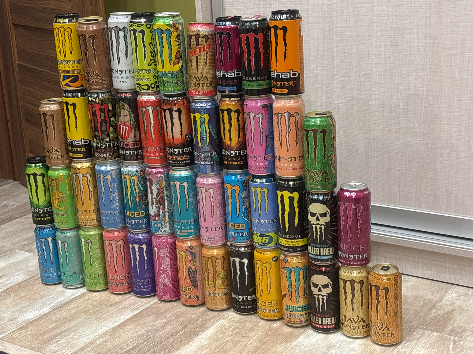 The image shows a large pyramid-shaped stack of Monster energy drink cans on a wood-patterned floor in front of a light-colored, textured wall. There are various flavors of Monster cans, including Reh…read more