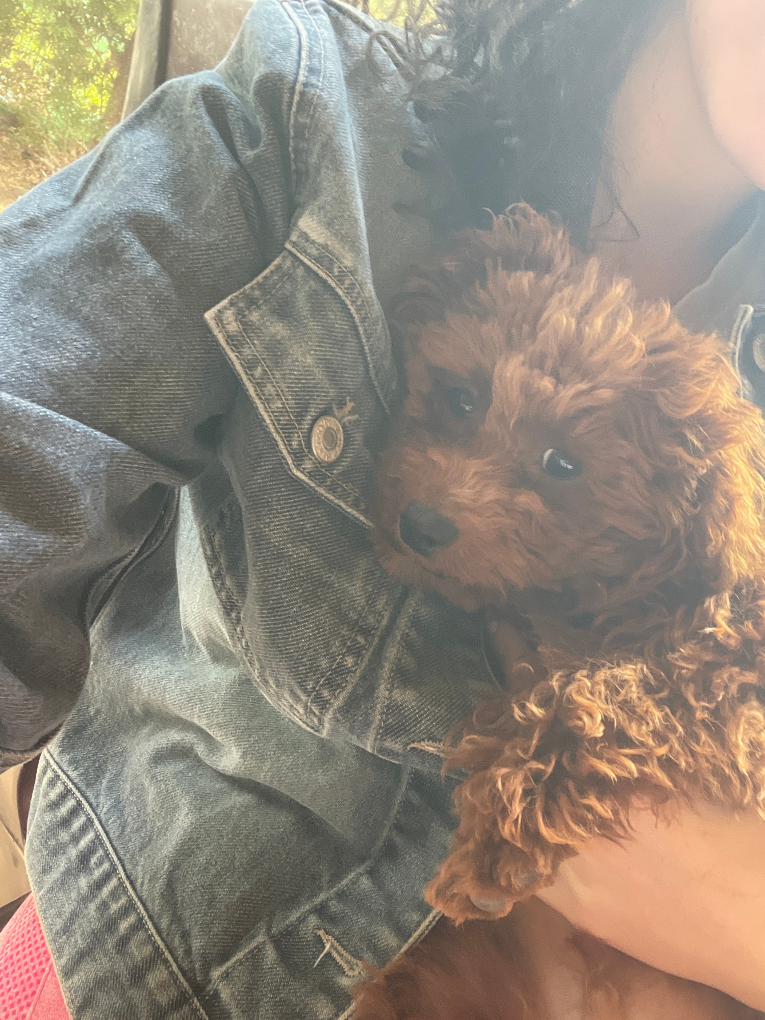 A medium-shot photograph shows a small, brown, curly-haired puppy resting on a faded blue denim jacket. The jacket appears to be worn by a person, with a portion of their arm visible under the puppy.…read more
