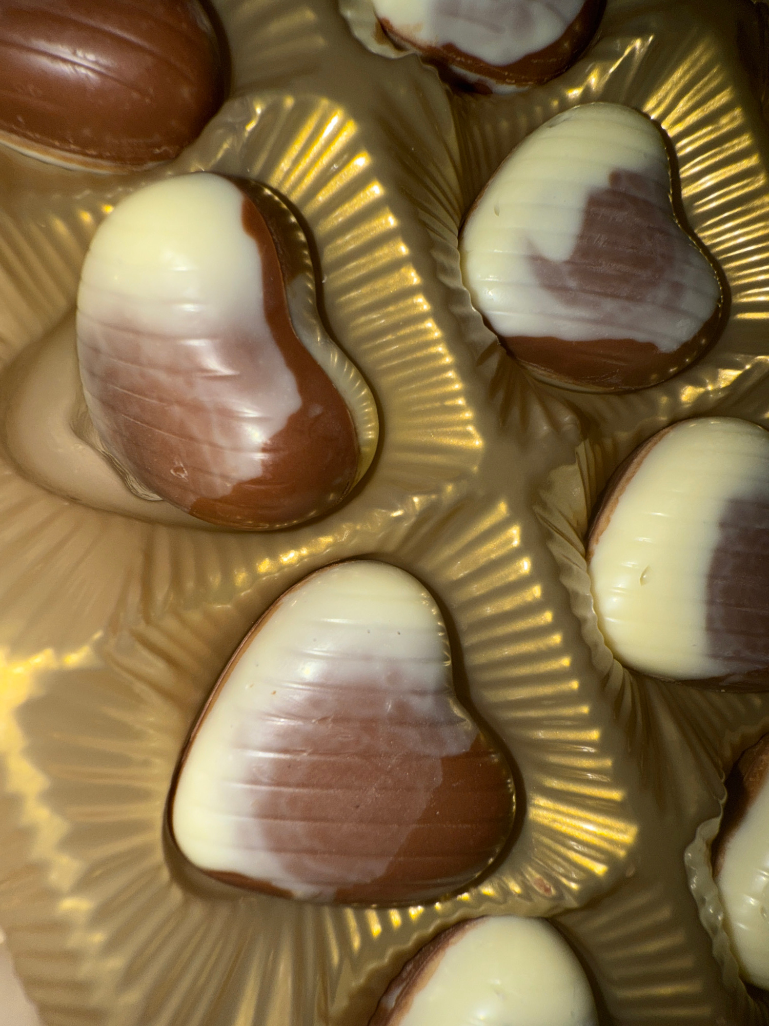The image displays an overhead view of several heart-shaped chocolates arranged in a golden, compartmentalized box. Each chocolate is a blend of dark and white chocolate, with the white chocolate appe…read more