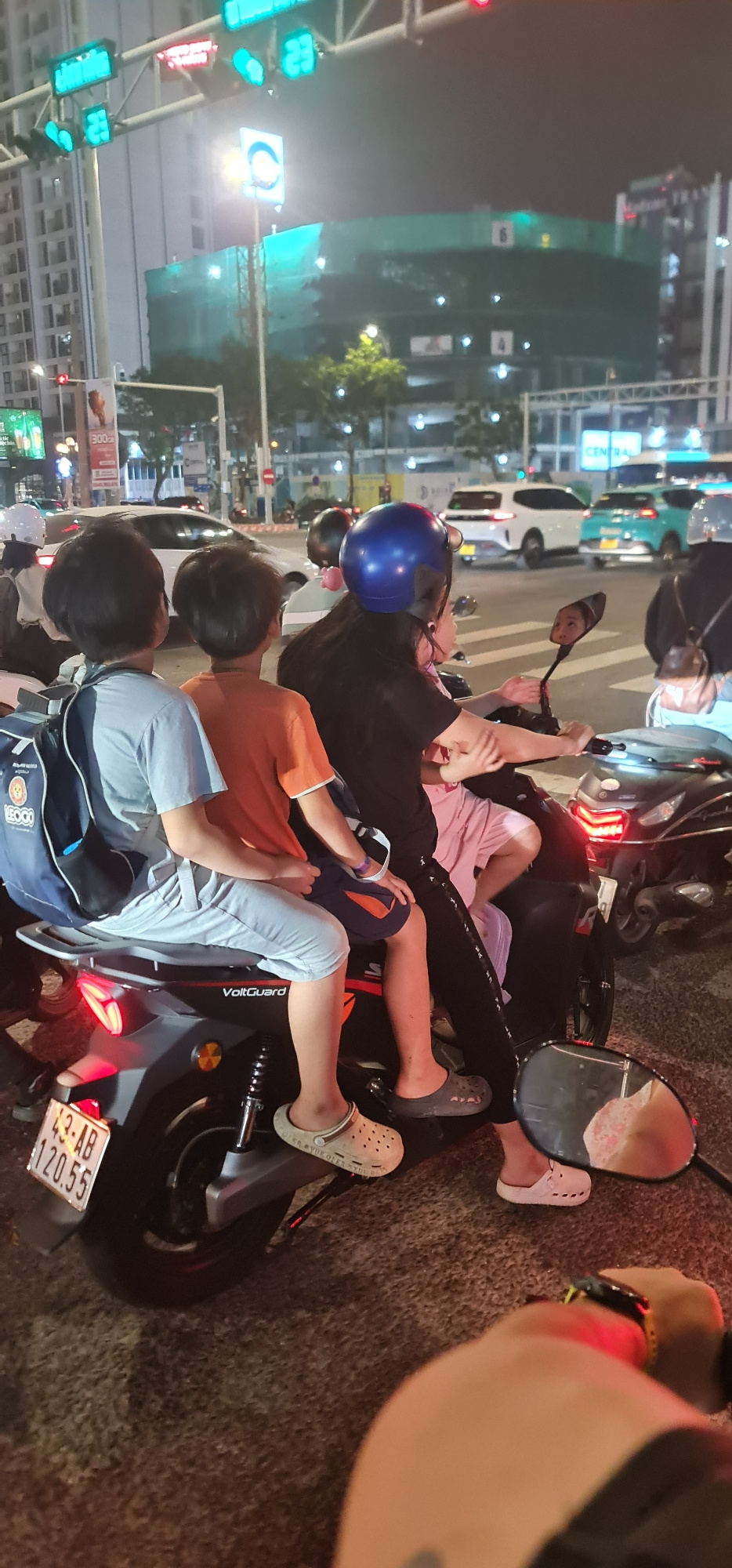 Scene: A traffic stop in Đà Nẵng, Vietnam at night. People: Four individuals of Asian descent are grouped around a scooter. One wears a blue helmet. The other three are not wearing helmets. Subjects…read more