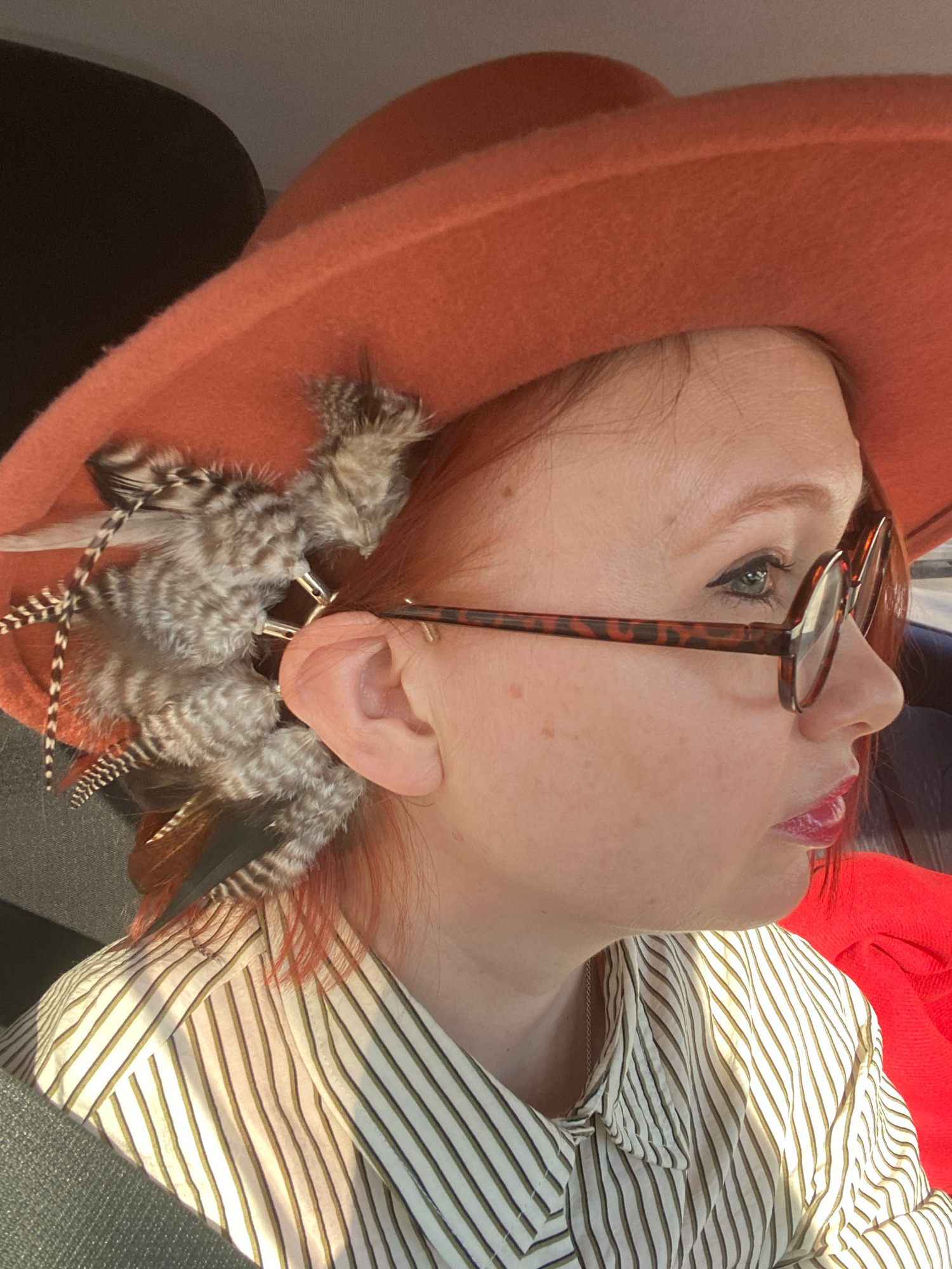 This close-up portrait, taken at an upward angle, features a person, likely female, from the neck up, reclined and looking towards the top right of the frame. The individual has fair skin, reddish-bro…read more