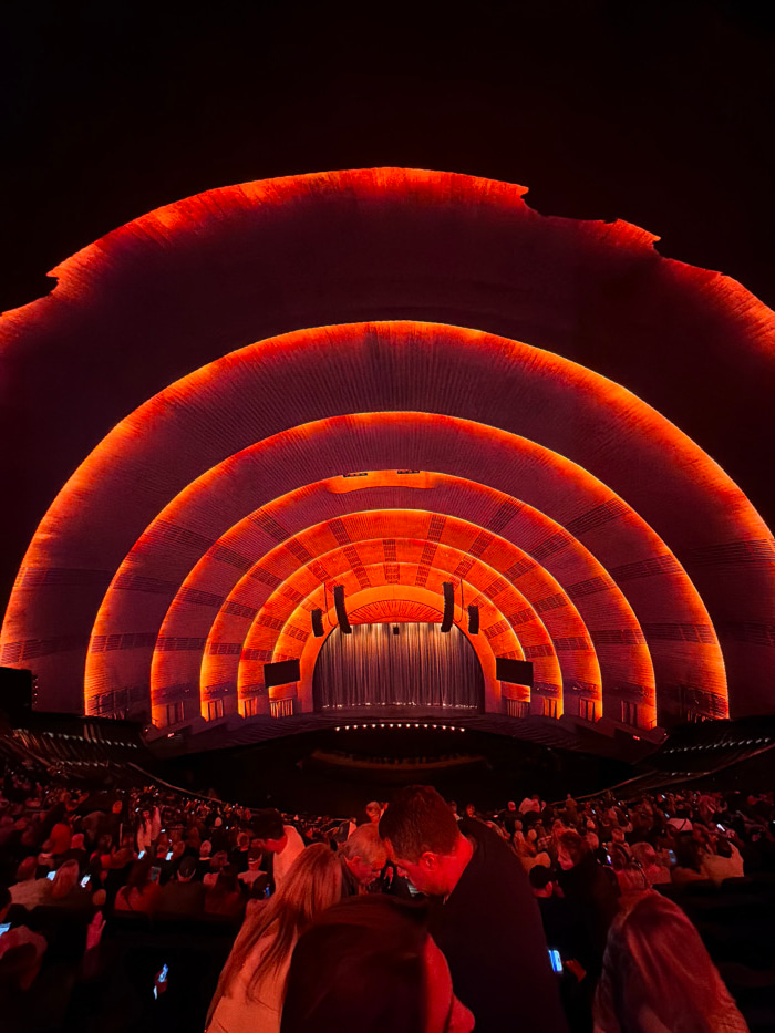 A view of a theater's interior, lit in orange hues. Concentric circles stretch across the ceiling, their edges glowing. Below, a dense crowd of people fills the seating area. Many are holding up phone…read more