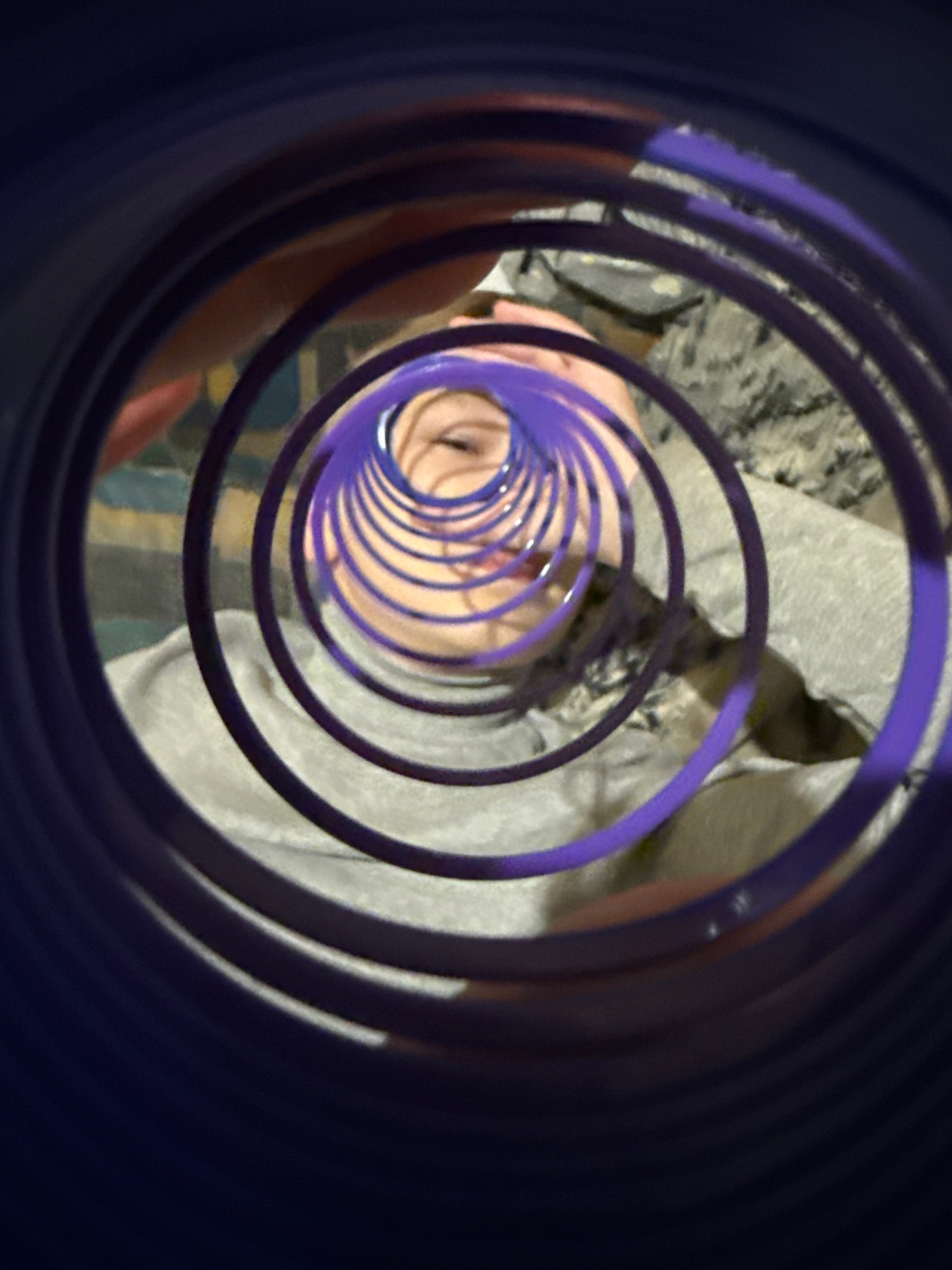 A child's face is visible at the center of a purple, spiral-shaped play structure. The background includes a light gray surface, possibly clothing or a playground feature. The scene is viewed from ins…read more