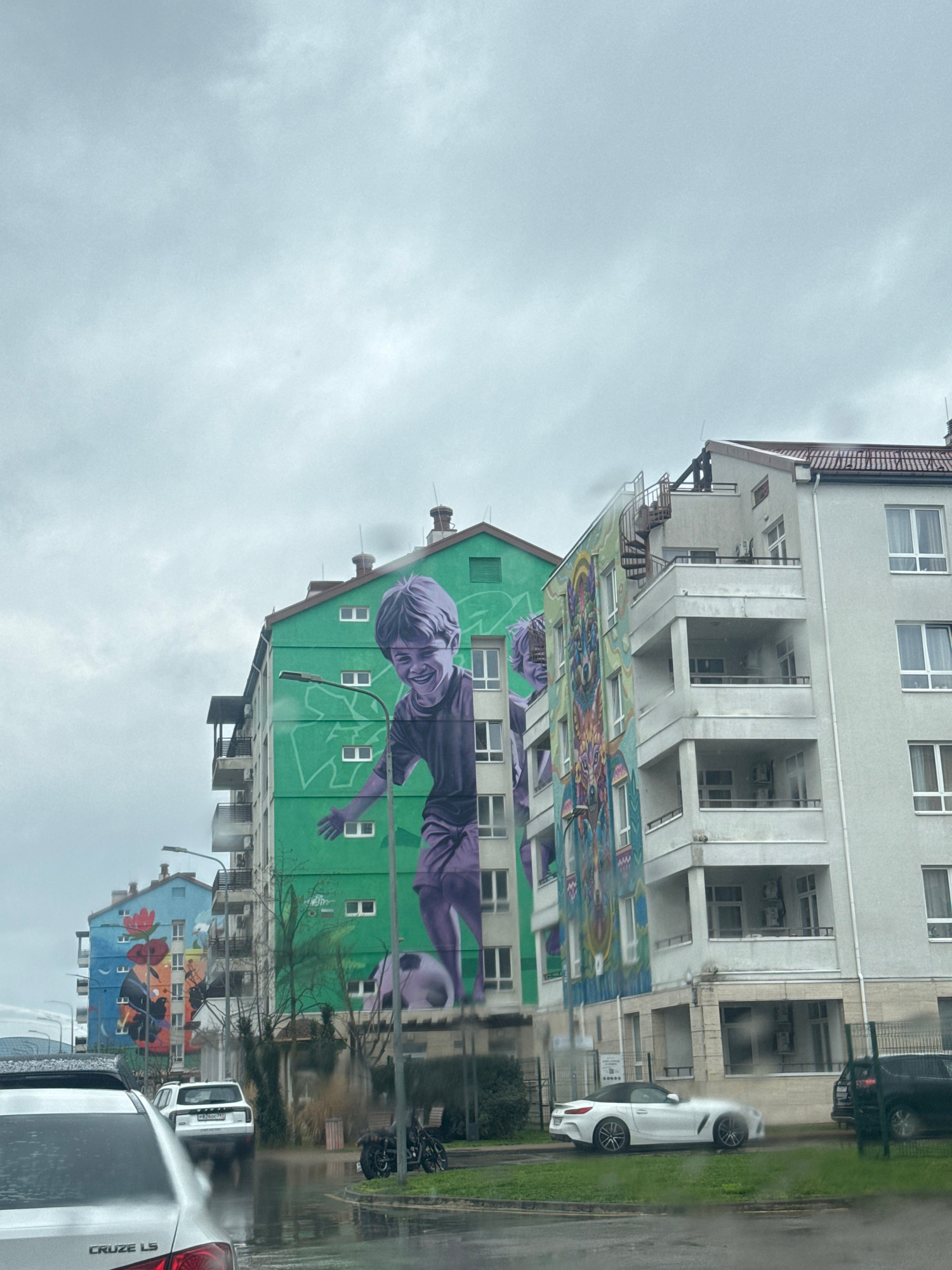 The image shows a street scene in Sirius, Russia, likely taken from inside a vehicle on a rainy day, based on the streaks on the glass. There are several buildings, most notably a green building with…read more