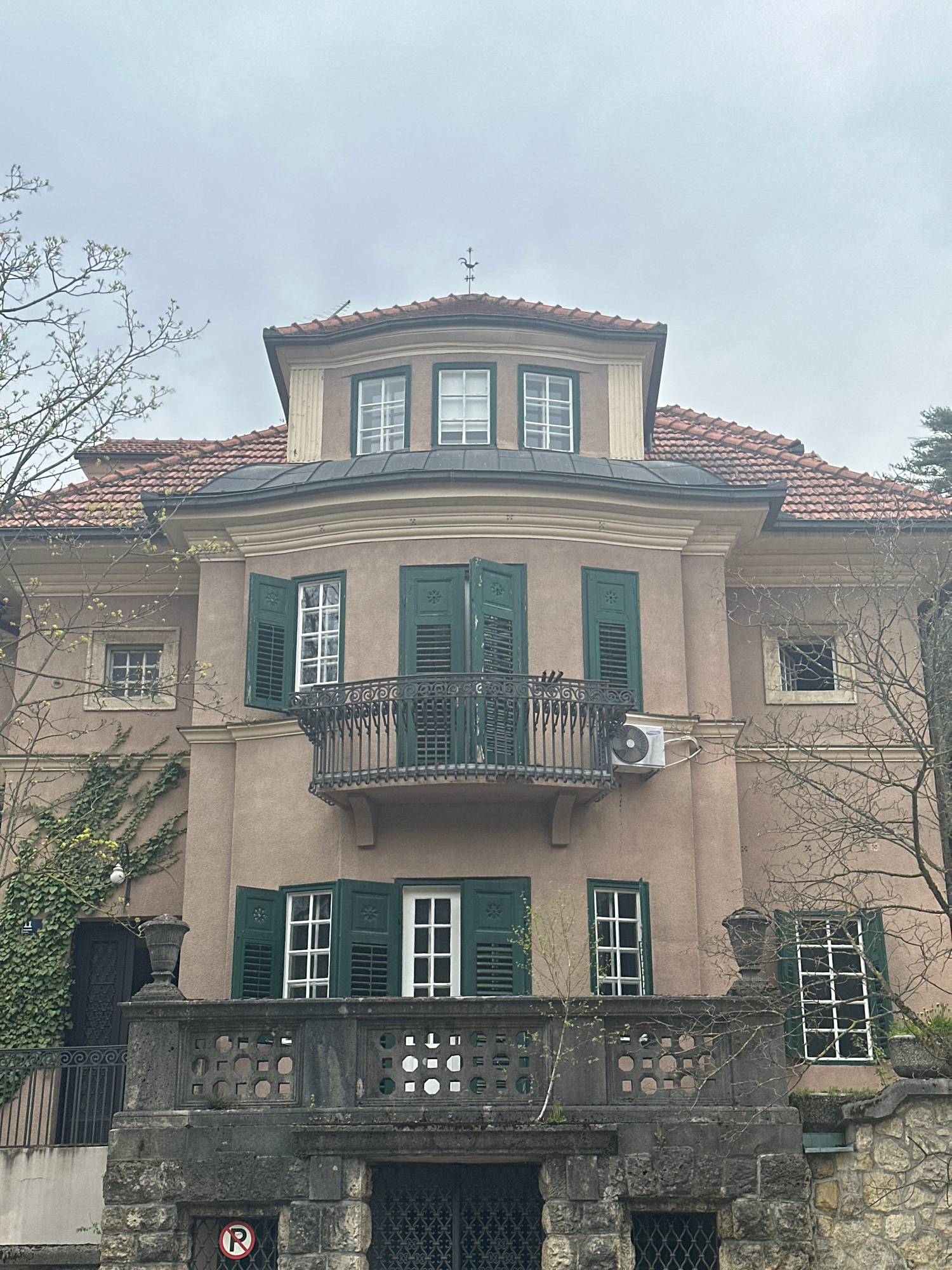 The image captures a section of a building in Zagreb, Croatia, showcasing distinctive architectural features. The building, likely residential or a similar establishment, exhibits a light brown facade…read more