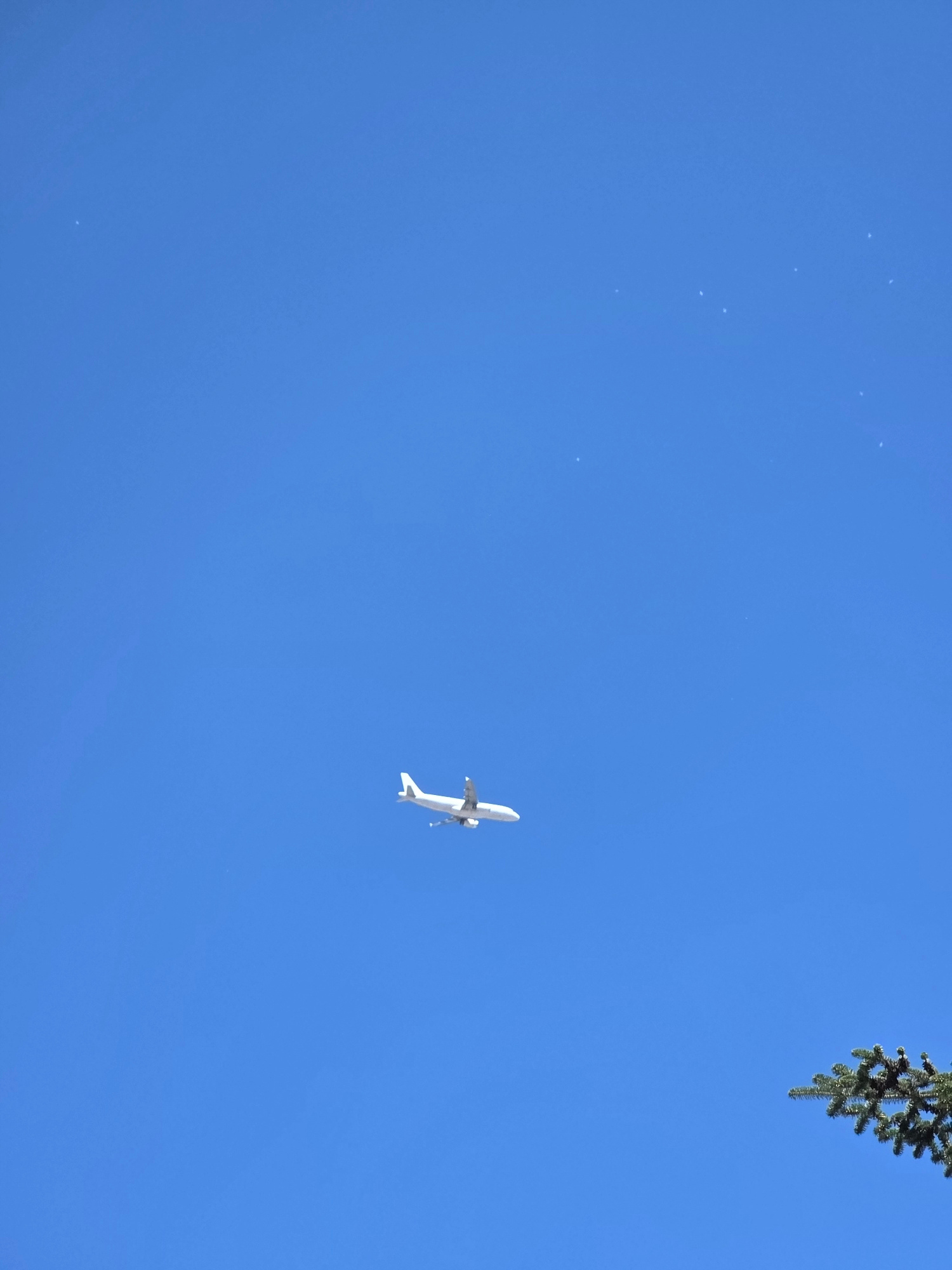 A low-angle shot captures a white airplane in flight against a clear blue sky. A pine branch is visible in the upper right corner. Small, blurred white spots are scattered in the upper left. The locat…read more