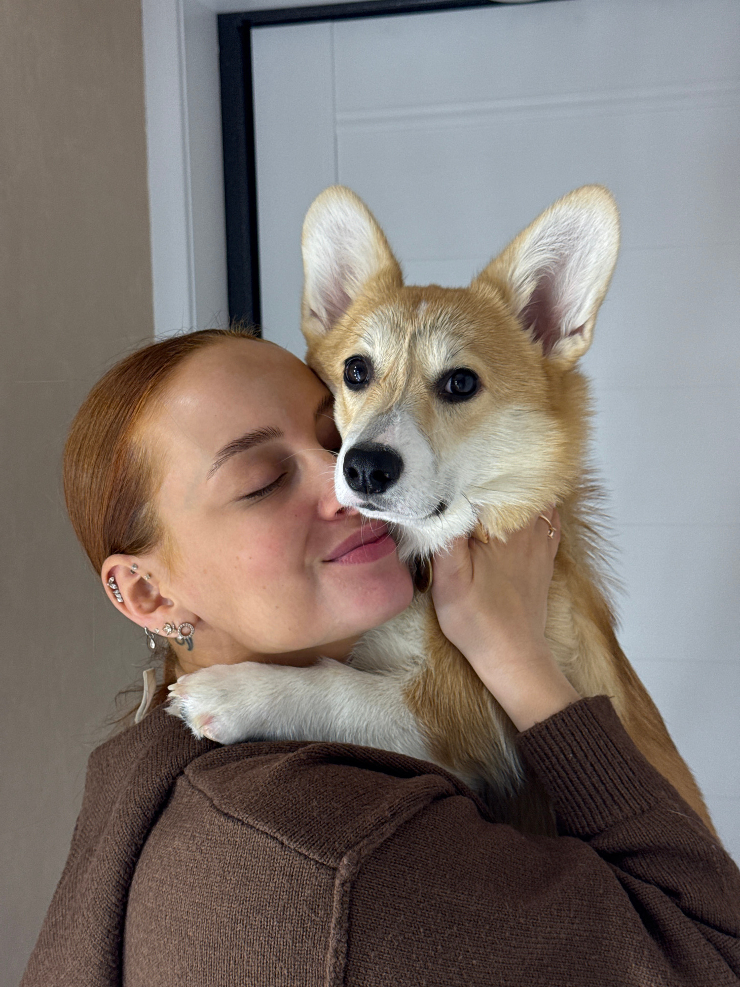The image captures a close, affectionate interaction between a person and a Corgi dog, set indoors in Chaikovsky, Russia. The shot is composed to emphasize the intimate connection between the two subj…read more