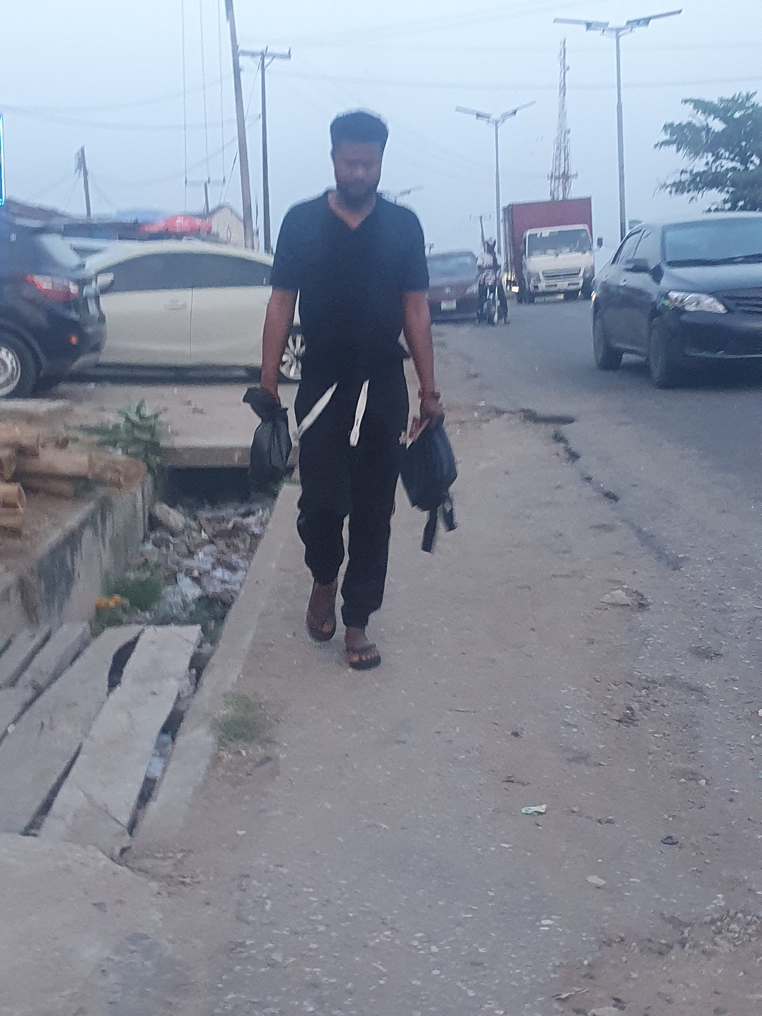 The image shows a man walking along a street in Lokoja, Nigeria. He is wearing dark clothing and sandals, and carrying a bag. The street is lined with parked cars, and a truck is visible in the distanβ¦read more