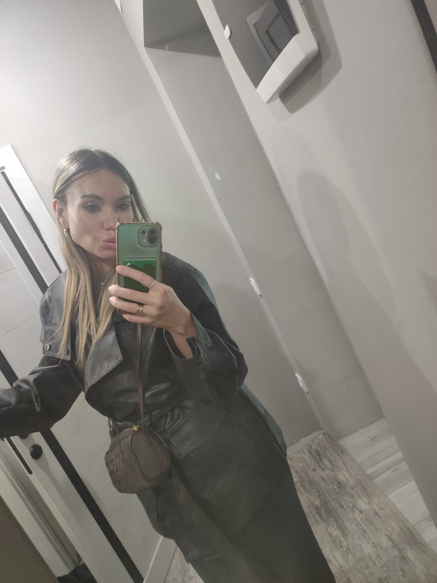 A woman stands in an interior space, likely a restroom or hallway, taking a selfie in a mirror. She is wearing a dark leather-like outfit, possibly a trench coat and skirt or dress, and a small brownβ¦read more