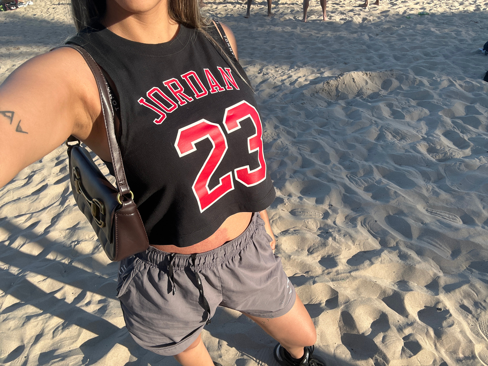 The image shows a person lying on a sandy beach. The person is wearing grey shorts, a black "Jordan 23" tank top, and black sneakers. They have a brown shoulder bag. The sand is light-colored with sha…read more