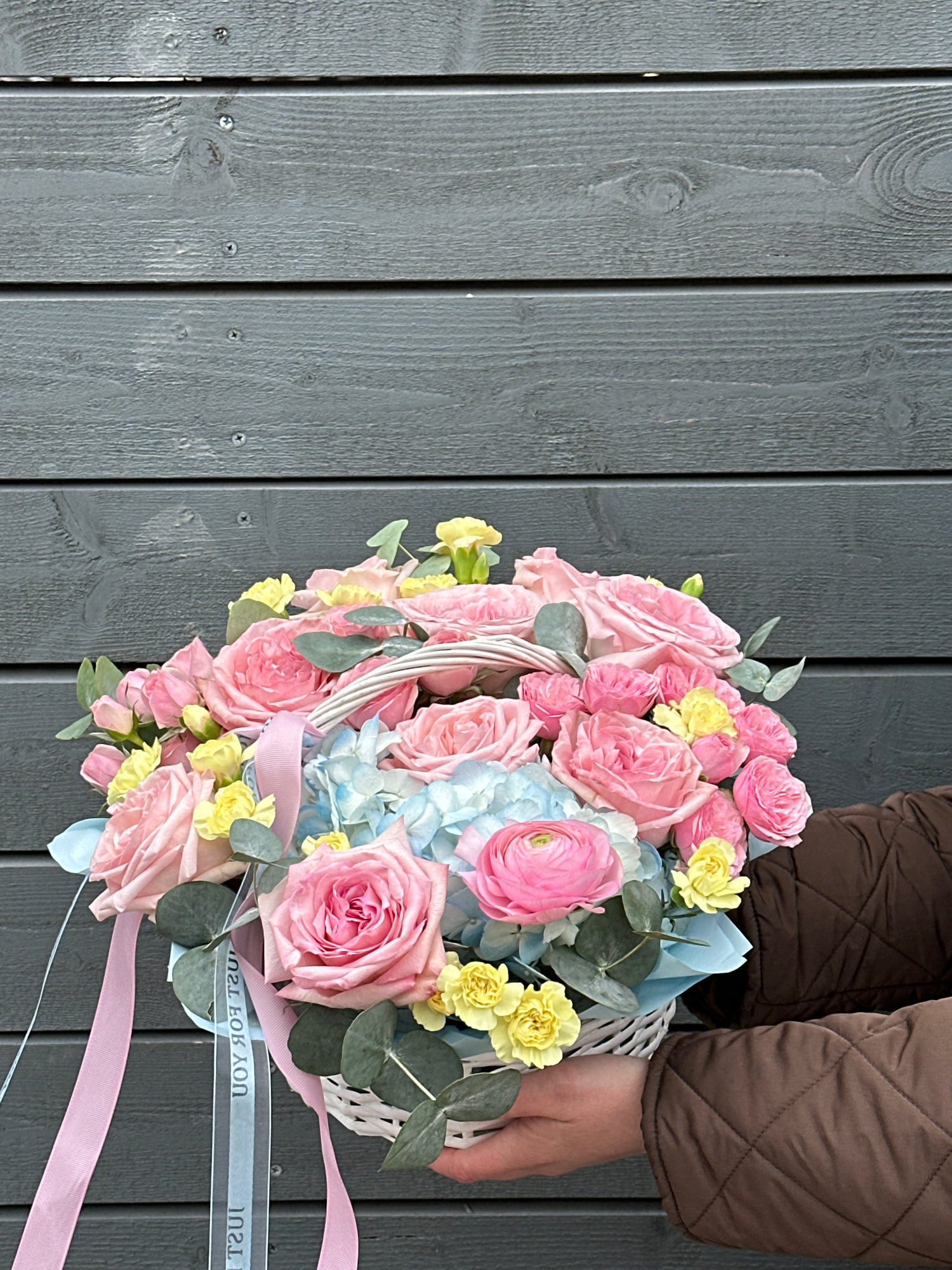 A person in a brown quilted jacket holds a white wicker basket filled with flowers. The flower arrangement consists of pink roses, pink ranunculus, yellow carnations, blue hydrangeas, and eucalyptus.…read more
