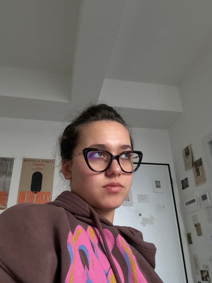 A woman with dark hair pulled back, wearing large black-framed glasses and a brown hoodie with pink and blue designs, poses indoors. Behind her is a white wall with several postcards or papers pinnedβ¦read more