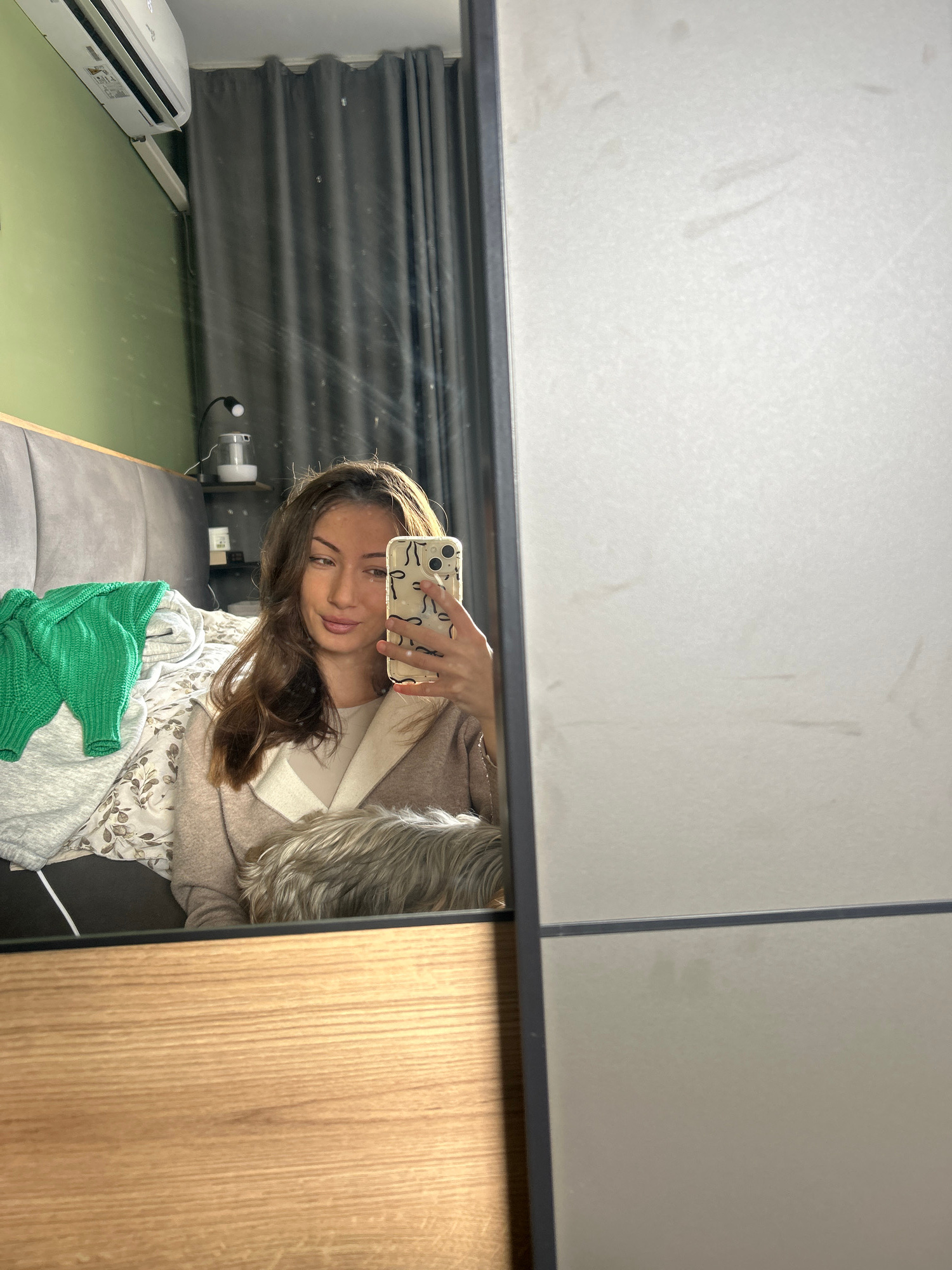 The image shows a selfie taken in a mirror. The reflection reveals a young woman holding a smartphone. She has brown hair and is wearing a beige coat over a white top. There is a green sweater on a be…read more