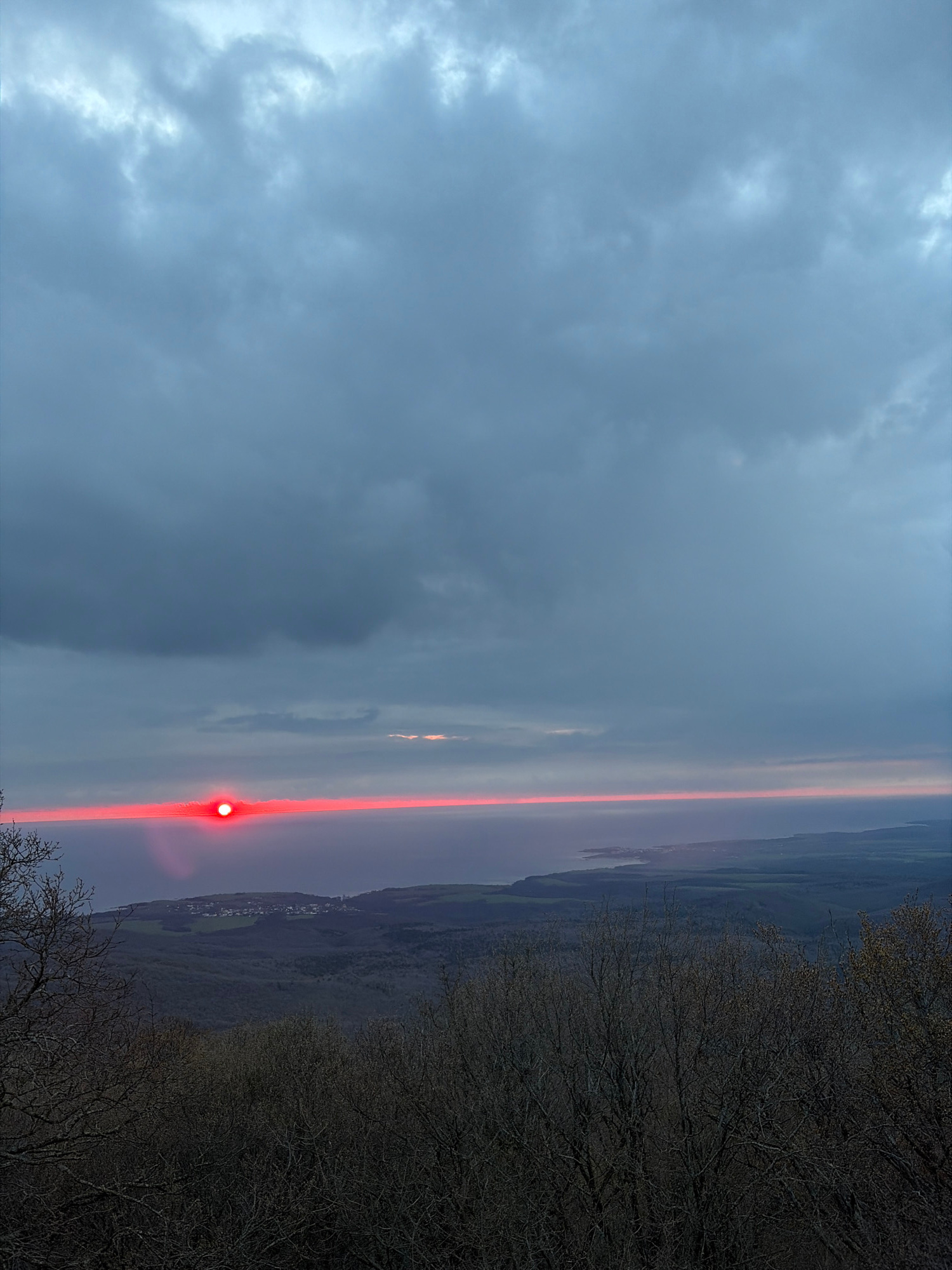 The image depicts a landscape at dusk or dawn. Overcast skies cover most of the view. A prominent red light is centered on a vertical axis near the middle of the frame, its glow extending along the wa…read more
