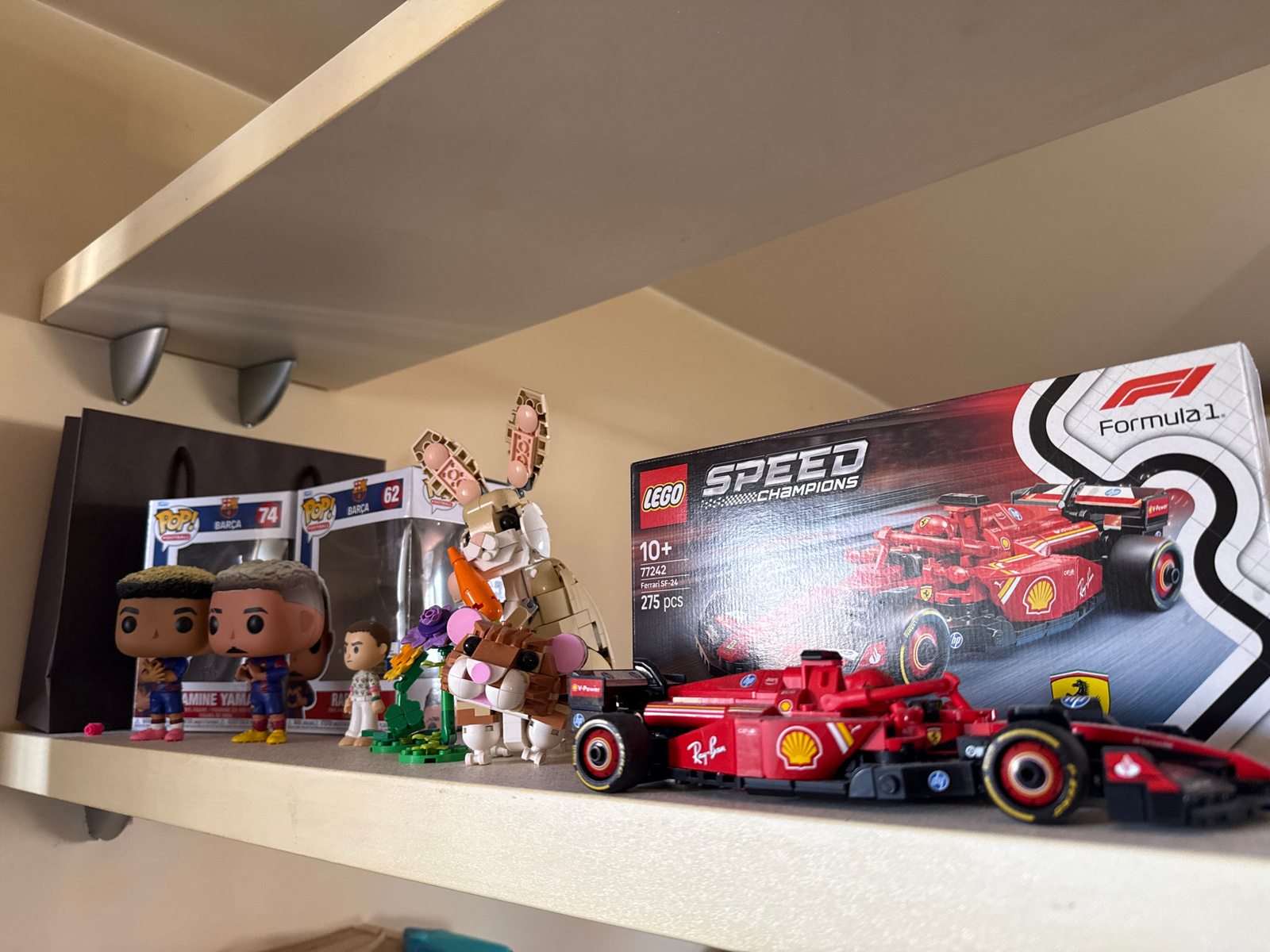 This indoor image, set in what is stated to be Sofia, Bulgaria, captures a collection of toys and collectibles displayed on a light-colored shelf against a warm beige wall. The perspective is low-angl…read more