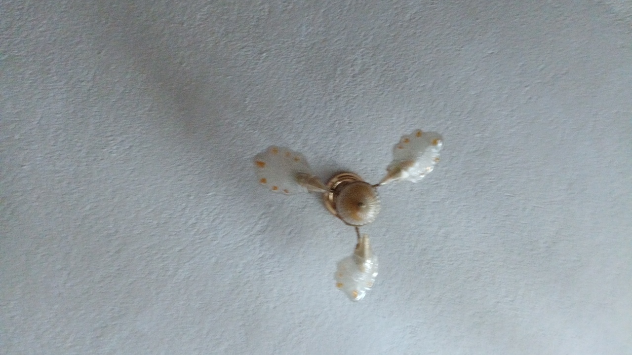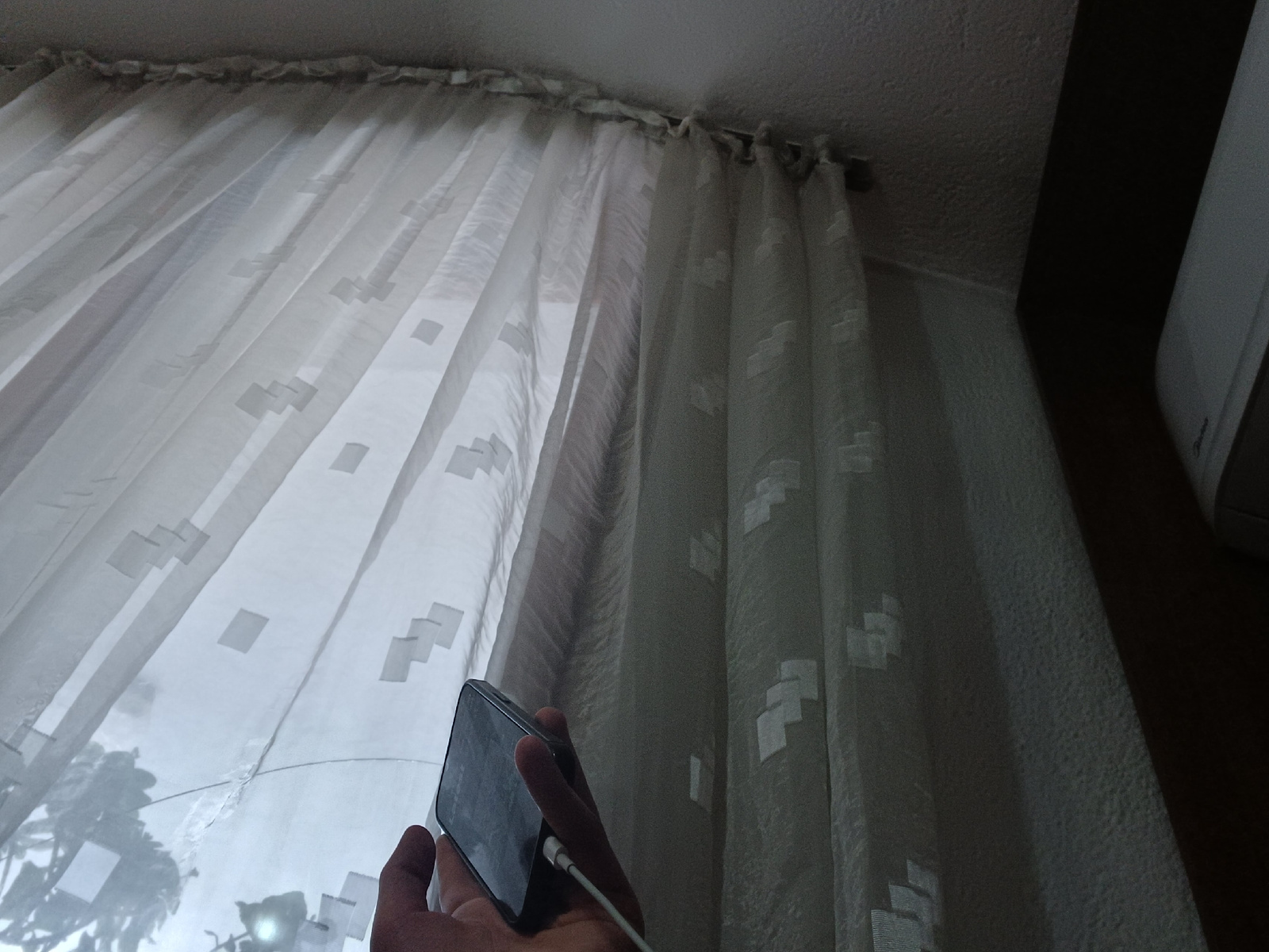 A hand holds a smartphone connected to a charging cable in front of a curtain. The curtain is patterned with square and geometric shapes. A white object is visible in the upper right corner of the ima…read more
