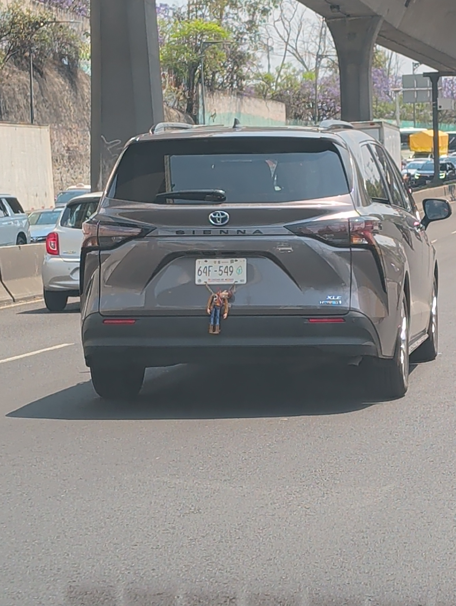 This daytime image captures the rear view of a dark grey Toyota Sienna XLE Hybrid minivan on an asphalt road, likely in Mexico City. The vehicle is either stopped or moving slowly in traffic, with oth…read more