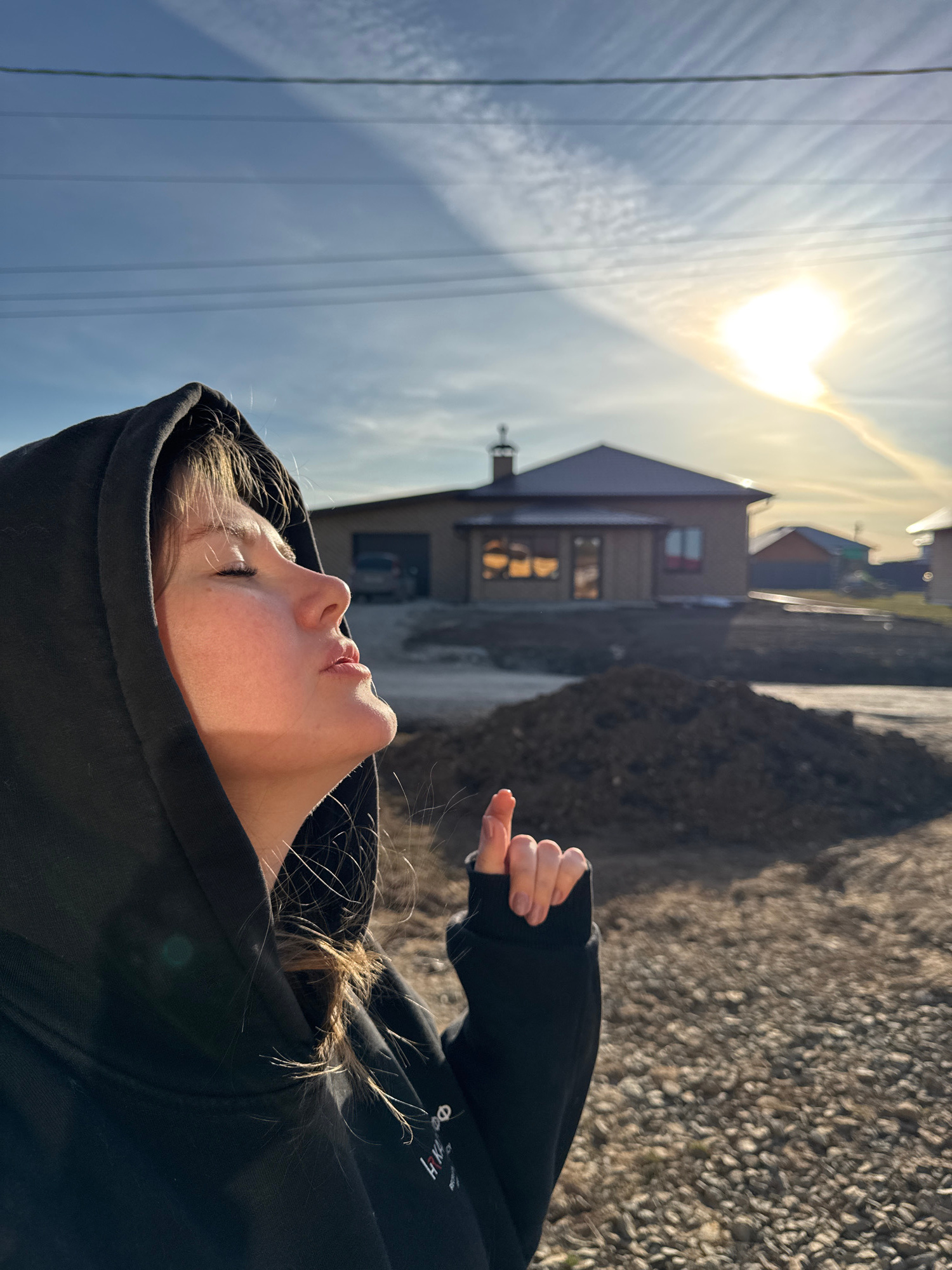 The image, when correctly oriented, captures a young person in the foreground, shown in profile, looking upwards and slightly to their left. They are wearing a black hoodie with the hood pulled up aro…read more