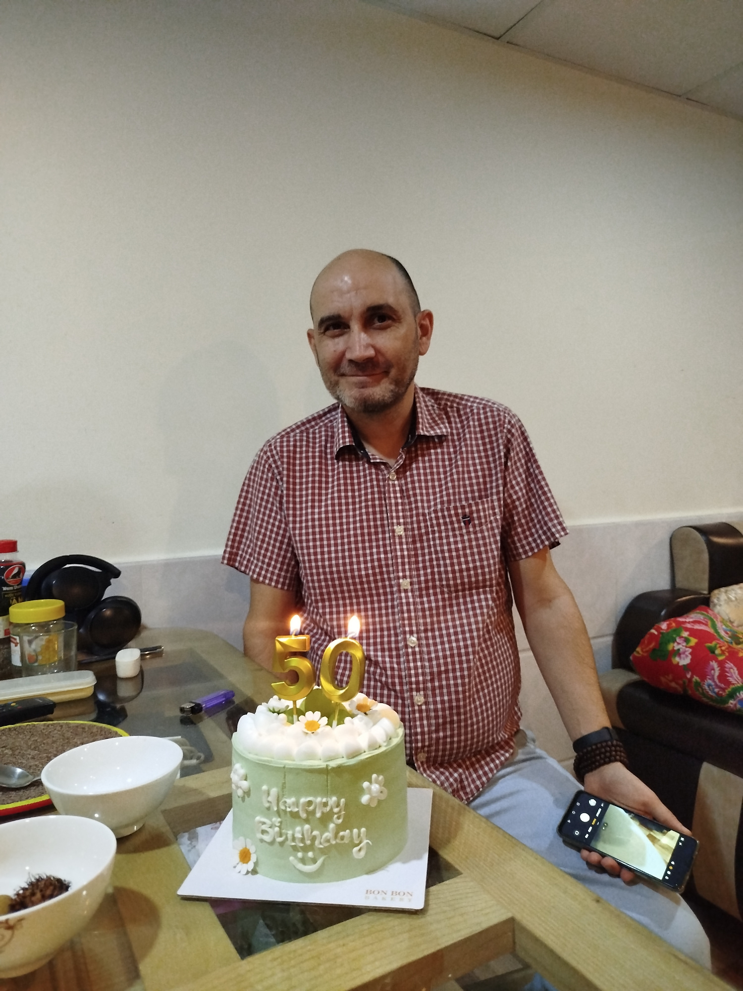 The image depicts a man celebrating his 50th birthday in an indoor setting, likely a home in Da Lat, Vietnam. The central subject is a bald man with a short beard, wearing a red and white checkered sh…read more