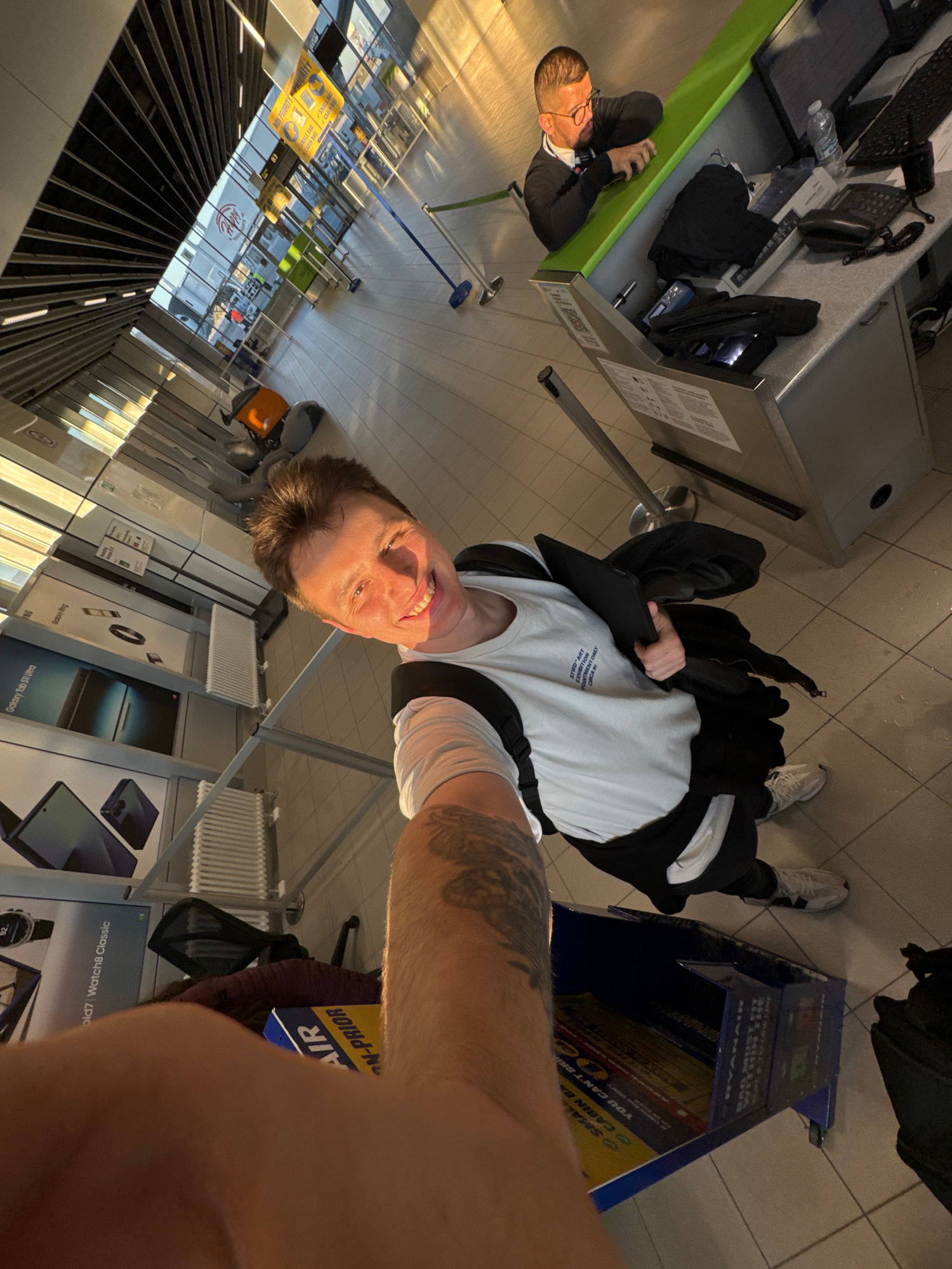 A selfie-style photograph shows a young man at Sofia Airport in Bulgaria. He is wearing a white t-shirt and black jacket and stands near a Ryanair baggage sizer. Background objects include check-in de…read more