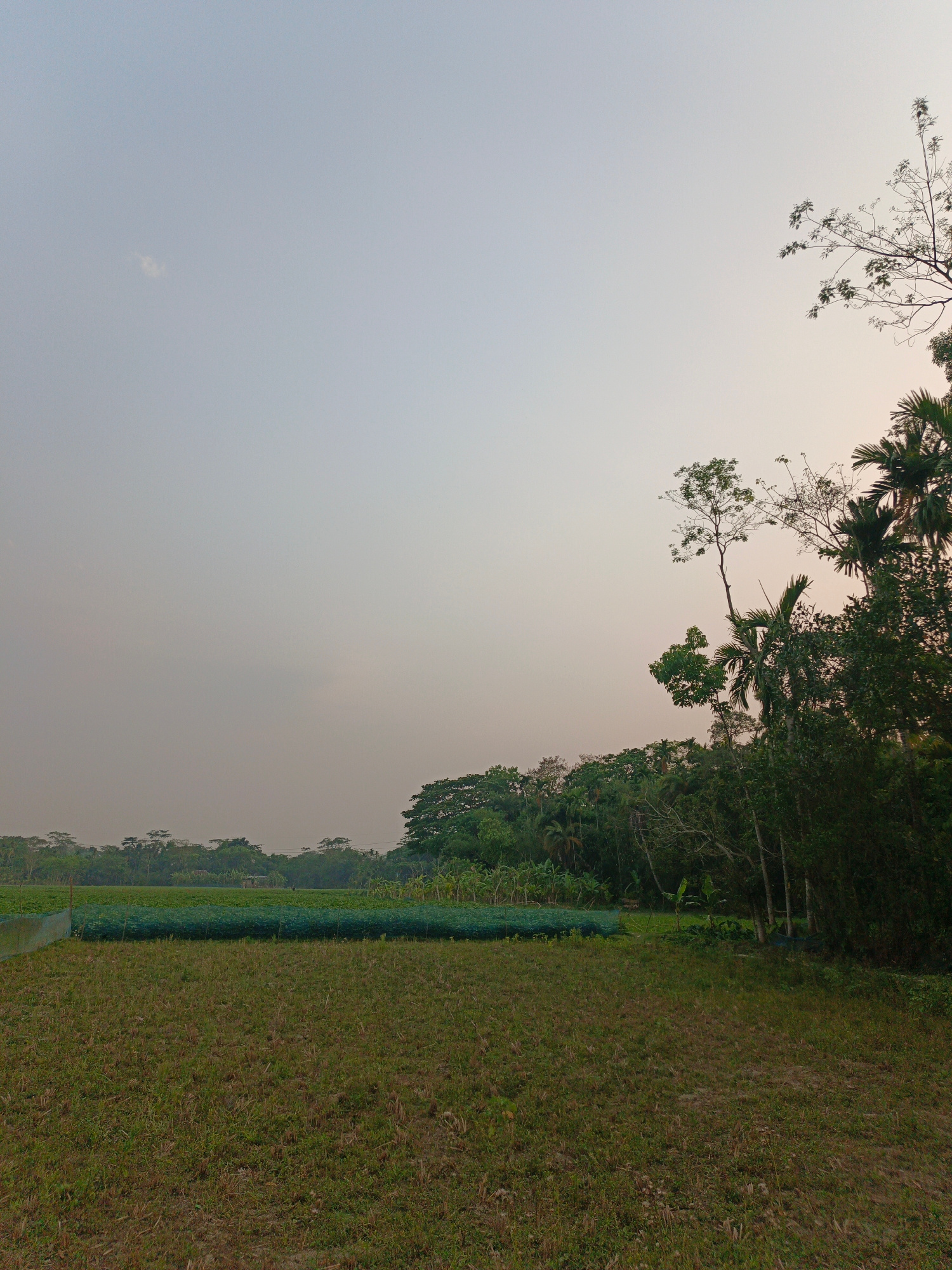This image presents a rural agricultural scene in Kauria, Bangladesh. The sky is a uniform, hazy light gray-blue with a single small, indistinct white cloud located in the upper left. The immediate fo…read more