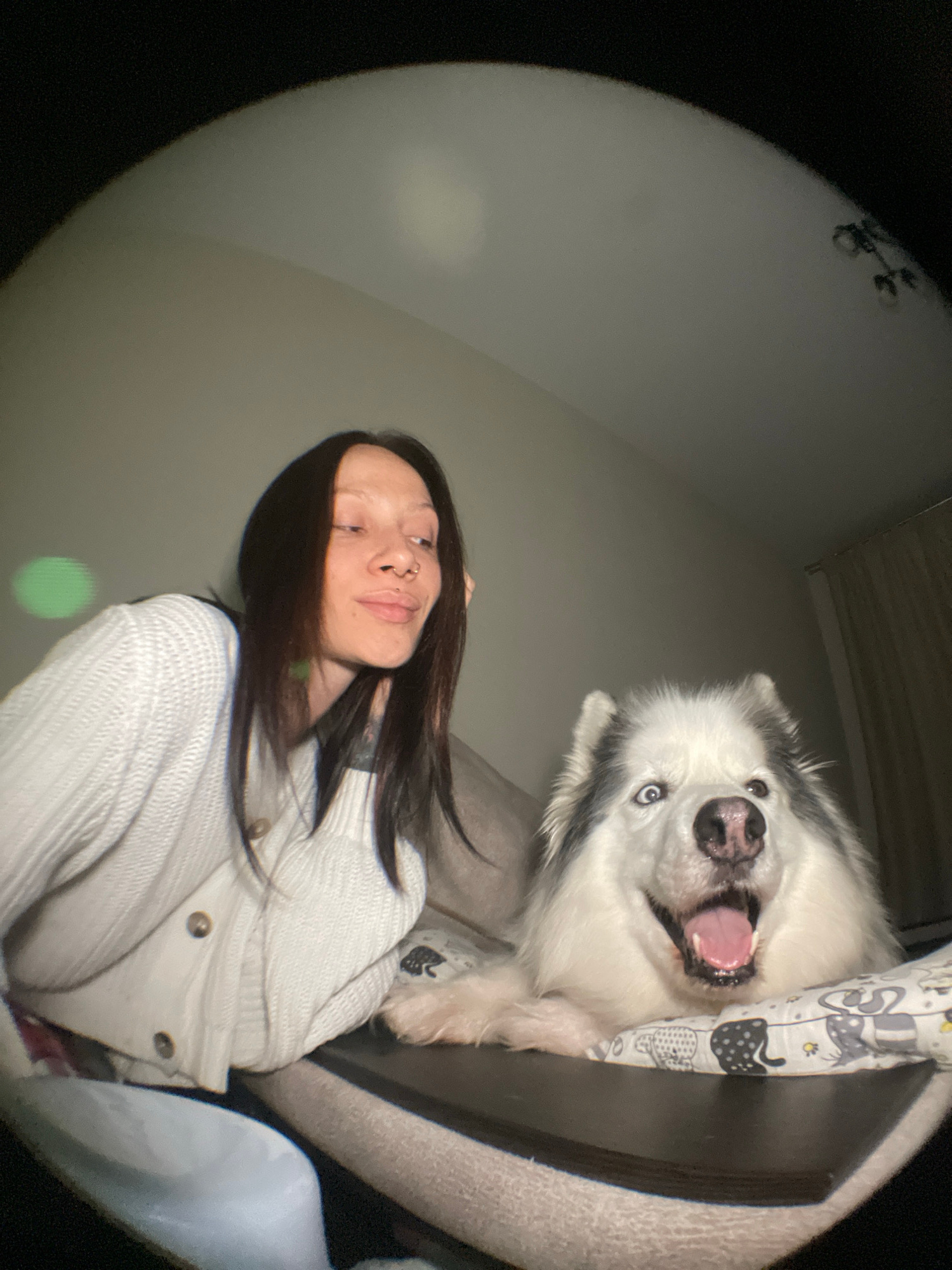 The image depicts a woman taking a selfie with a white and gray husky dog. The woman has dark hair, and a nose ring and is wearing a white cardigan. The husky is in a dog bed. The image has a fisheyeβ¦read more