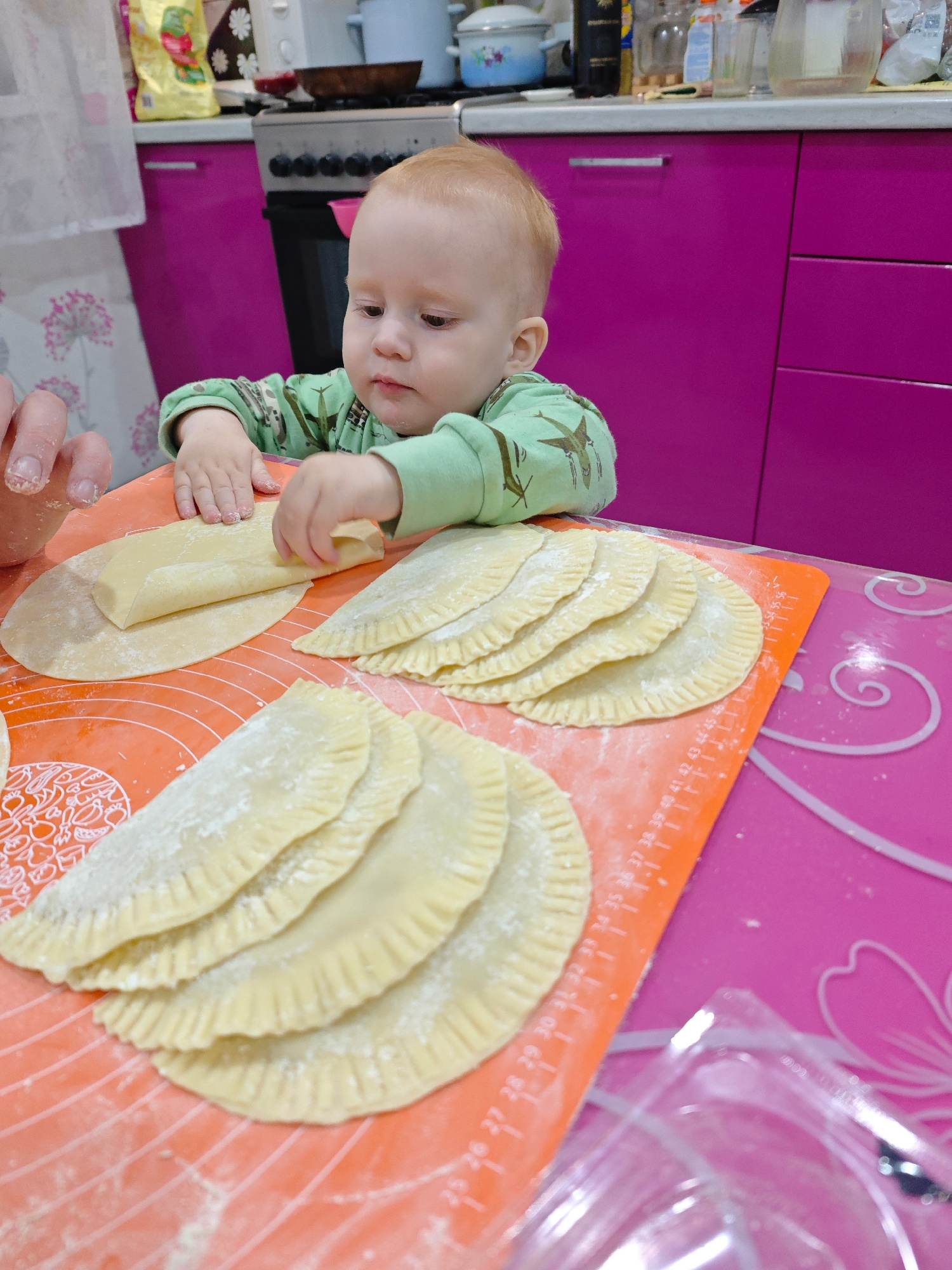 A close-up shot shows a young child in a green patterned shirt at a table. The child is in the process of folding a piece of dough, with several similar dough-filled pastries already prepared nearby.…read more