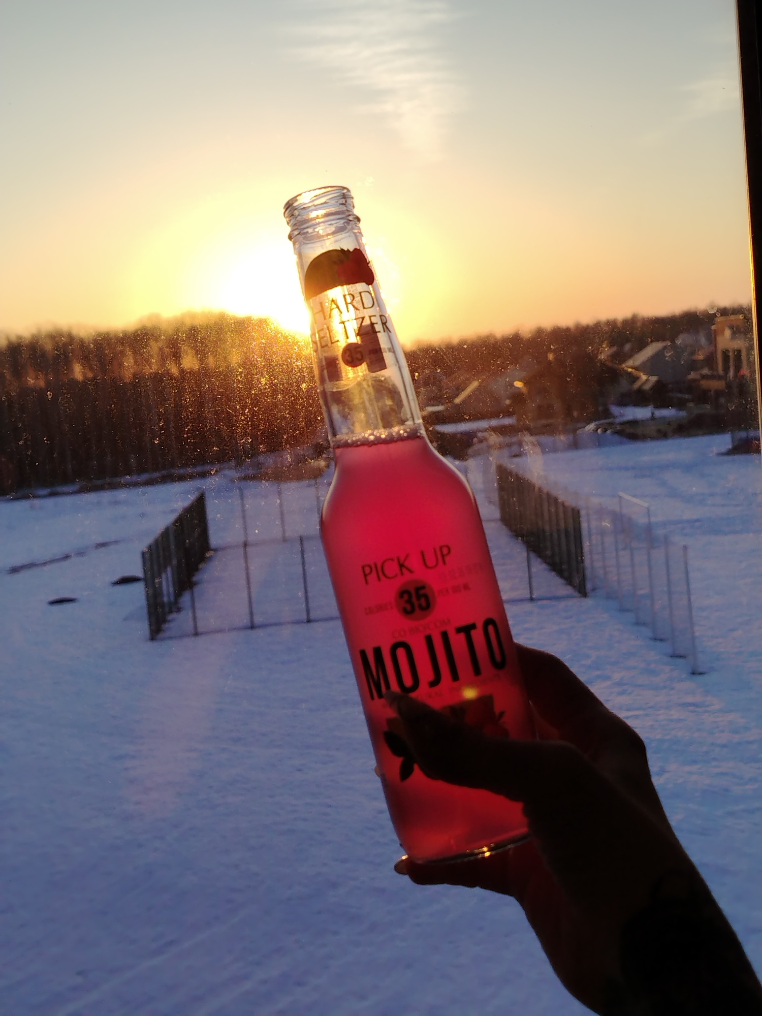 A hand holds a bottle of "Pick Up Mojito" hard seltzer in front of a window with a snowy landscape and a setting sun. The bottle is clear with a pink liquid inside and has "Hard Seltzer" and "Mojito"β¦read more