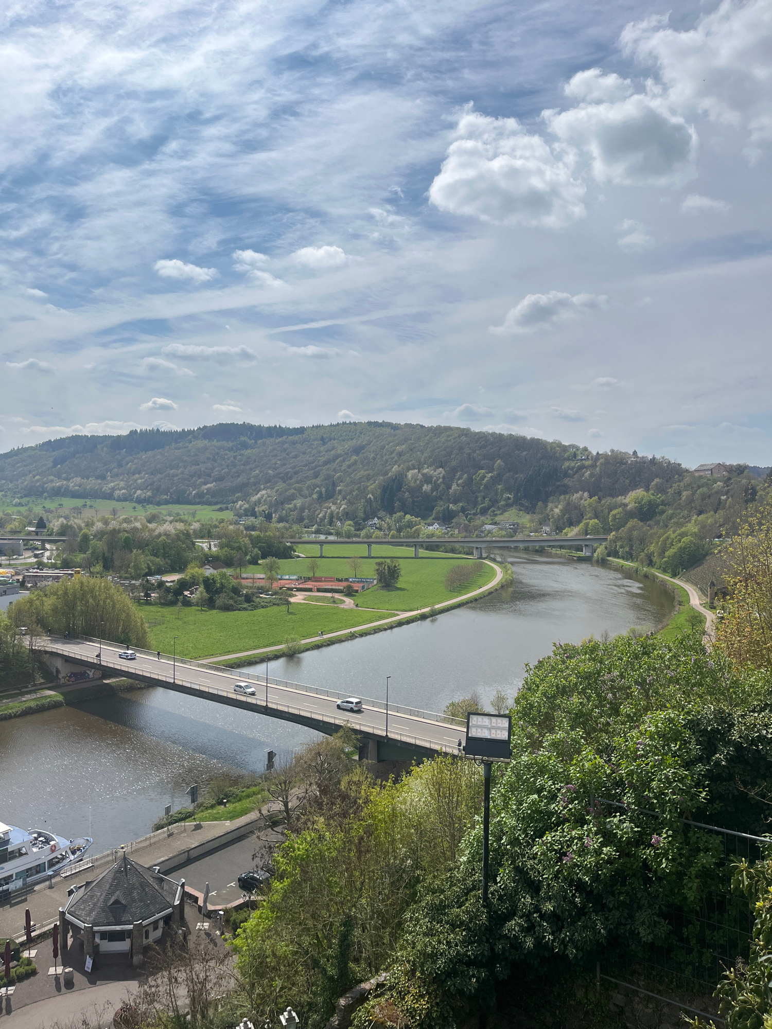 The image is a vertical aerial view of Saarburg, Germany, featuring a river with a bridge spanning it. The landscape is marked by a tree-covered hill on one side and buildings on the other. Cars are v…read more