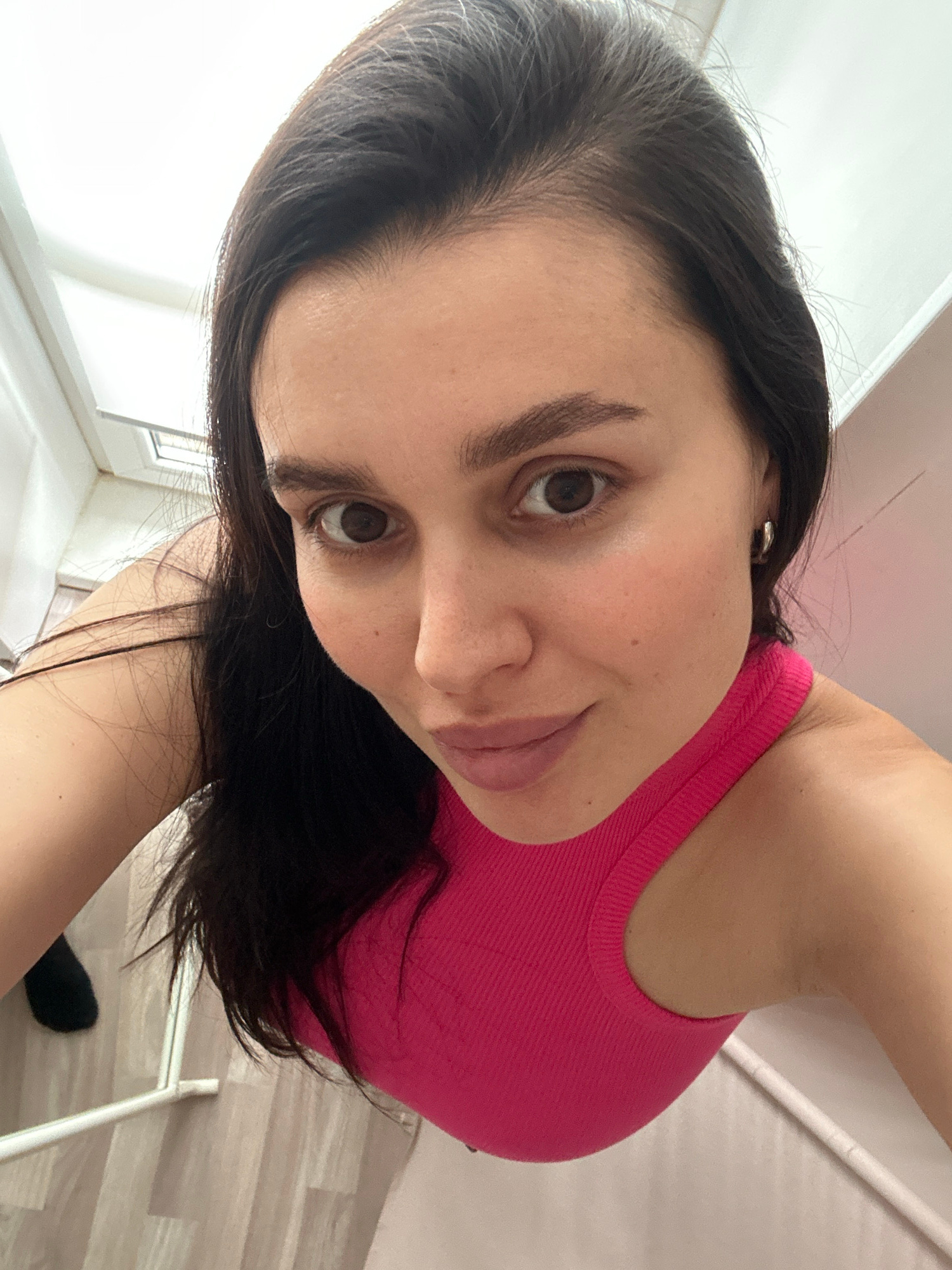 A selfie of a woman with dark hair wearing a pink tank top. She is looking directly at the camera with a slight smile. The background shows part of a room with a window and light-colored walls. Part o…read more