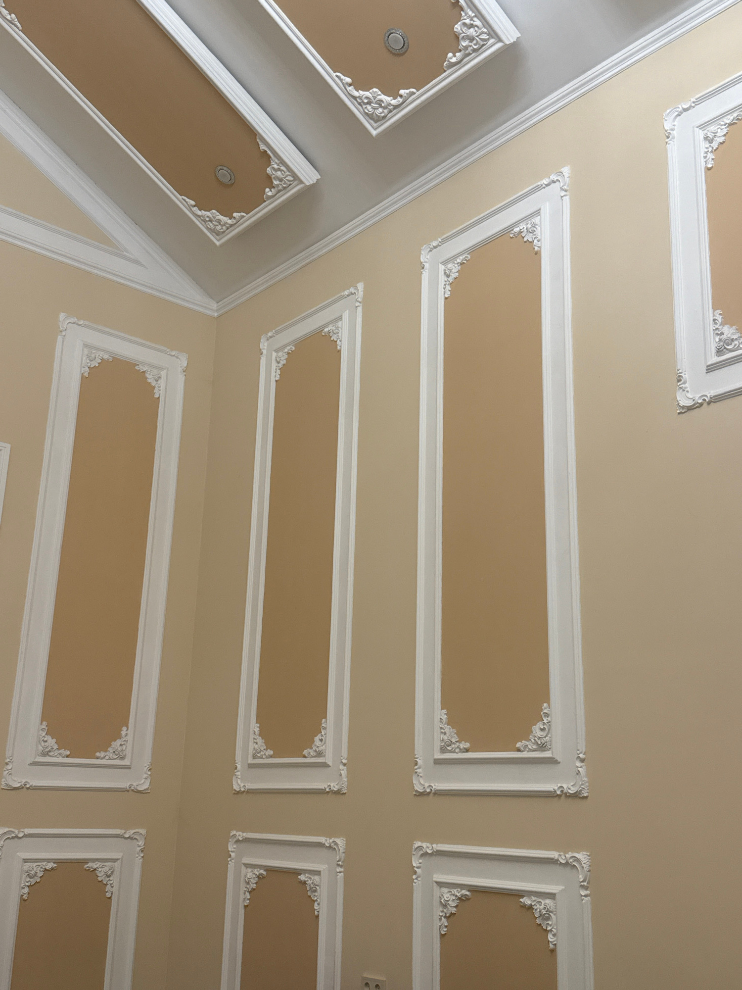 The image shows a ceiling with ornate, rectangular decorative panels. The panels are beige in the center and surrounded by white, decorative molding. Some panels contain recessed lights. The picture m…read more