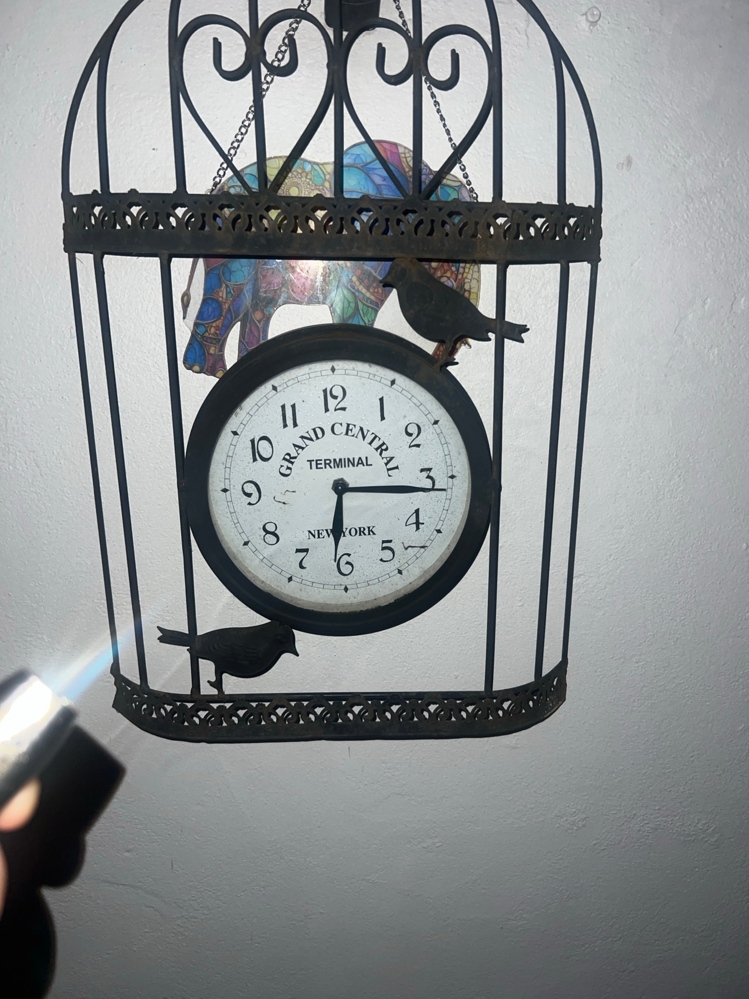 A birdcage-shaped clock is hanging on a white wall. The clock face reads "Grand Central Terminal New York". The time shown is approximately 3:01. The birdcage is made of dark metal with decorative scr…read more
