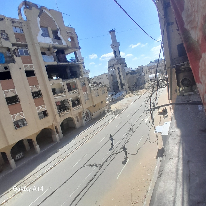 The image displays a severely damaged urban street scene in Khan Yunis, Palestinian Territory, captured from an elevated vantage point on a clear, sunny day. A multi-story building on the left exhibit…read more