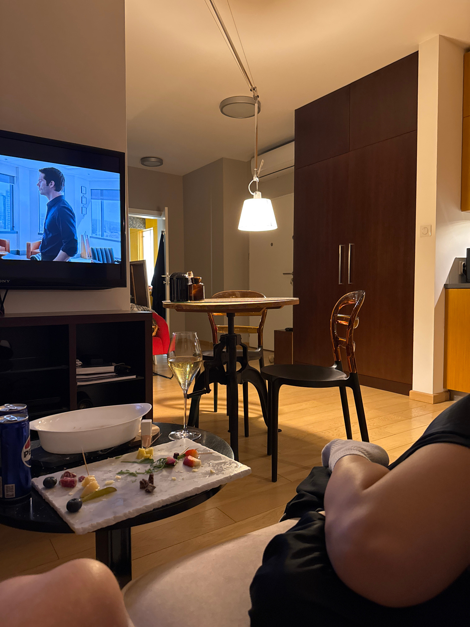 A person is sitting in a room with a television playing a scene of a person in an office. A table near the person has a plate with food, a bowl, and cans of a beverage. Behind the table is a shelving…read more