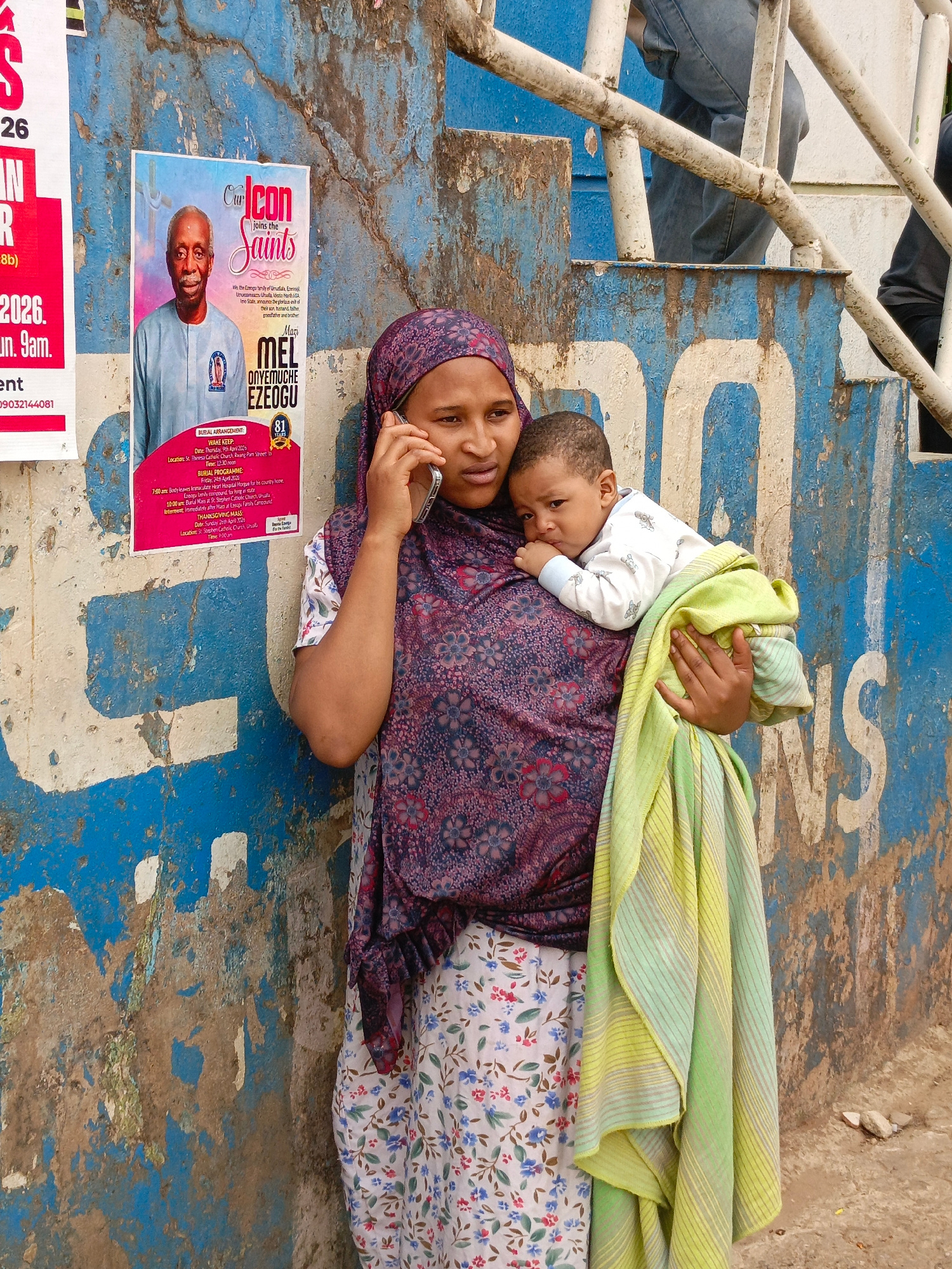 A woman stands against a blue wall with white lettering. She wears a floral dress and a patterned headscarf, holding a baby wrapped in a striped blanket. She is on a phone call. Behind her are two pos…read more
