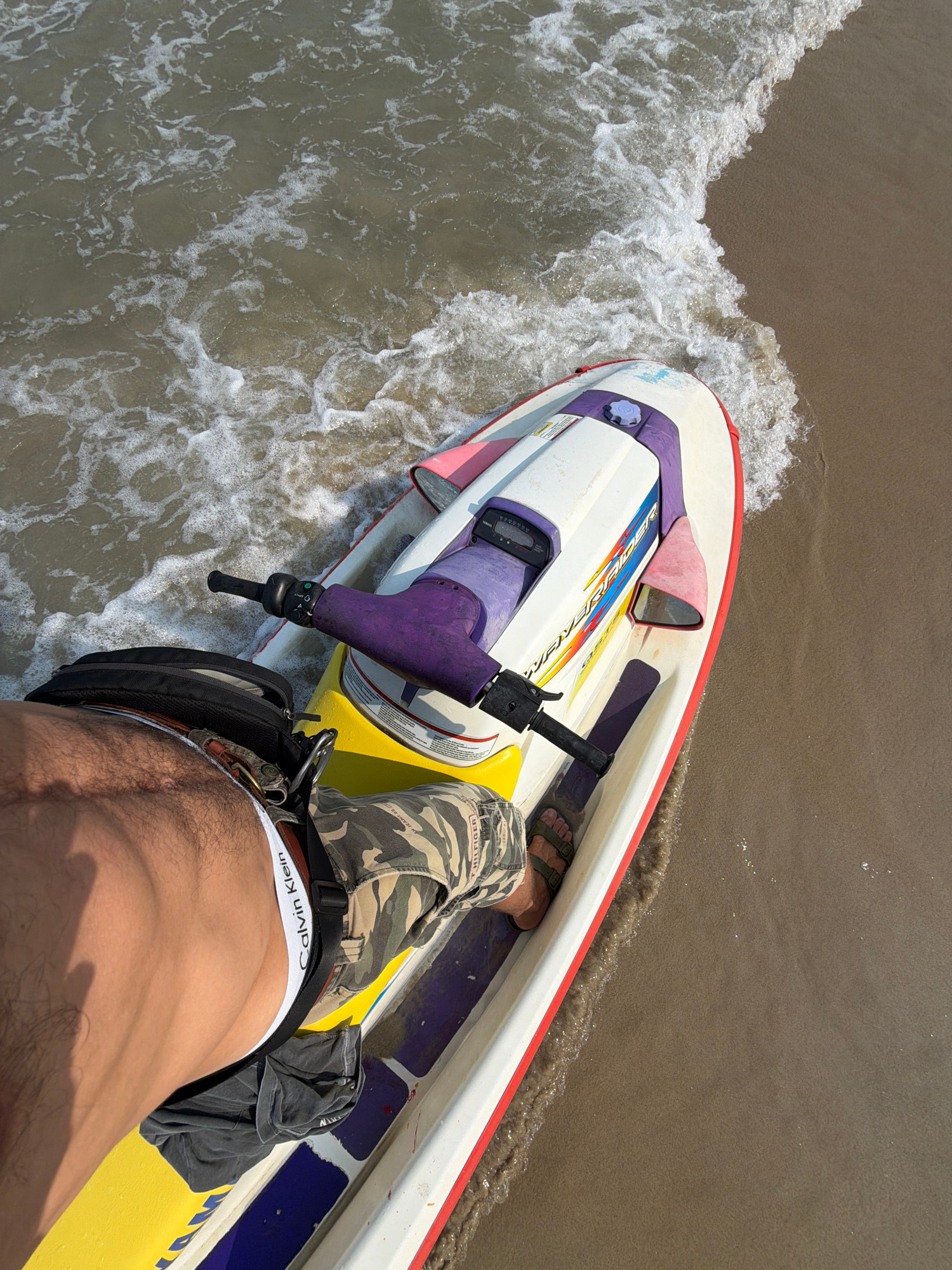 A high-angle shot shows a person on a white, red, and yellow WaveRunner-style personal watercraft in Đà Nẵng, Vietnam. The craft is partially submerged in foamy seawater near a beach. The person wears…read more