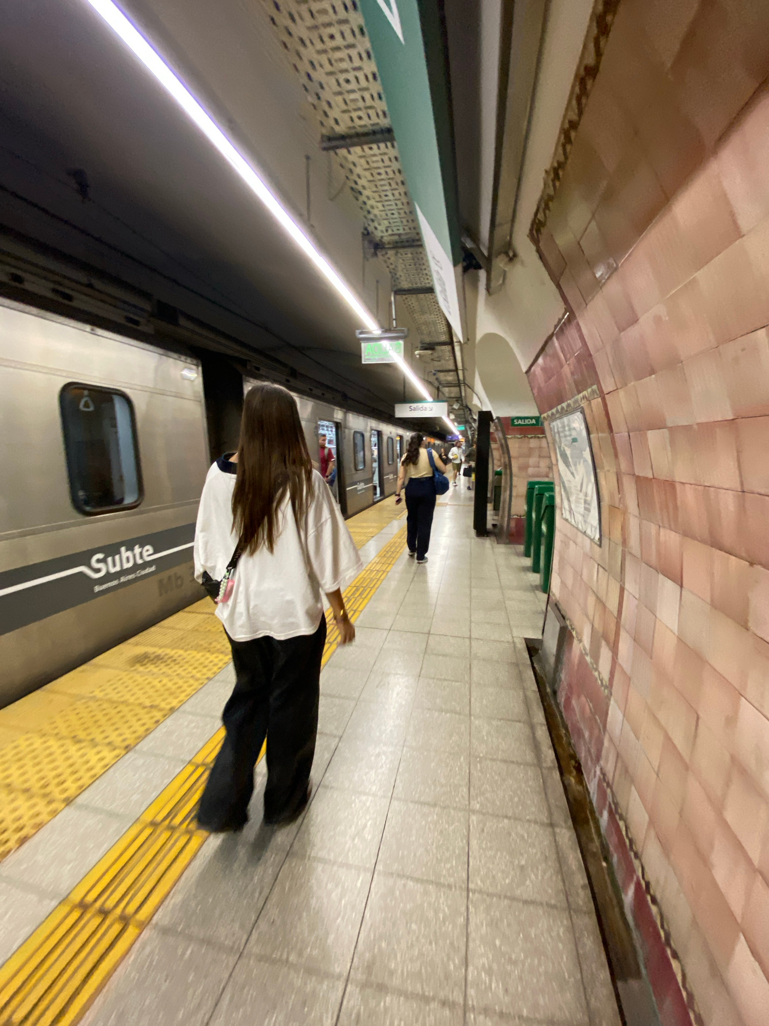 The image captures a scene inside a subway station in Buenos Aires, Argentina. The arched ceiling above is tiled in light brown and beige hues. On the right side of the frame, a person is standing onβ¦read more