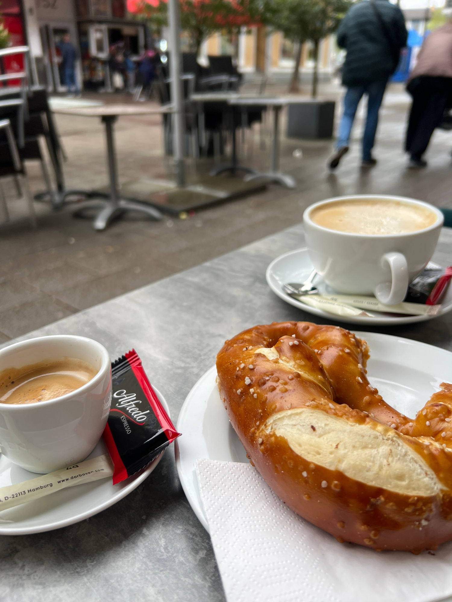 The image captures a scene at a cafe in Kehl, Germany. A pretzel rests on a white plate with a napkin. Beside it are two cups of coffee, each with a saucer and a small package of Alfredo Espresso coff…read more