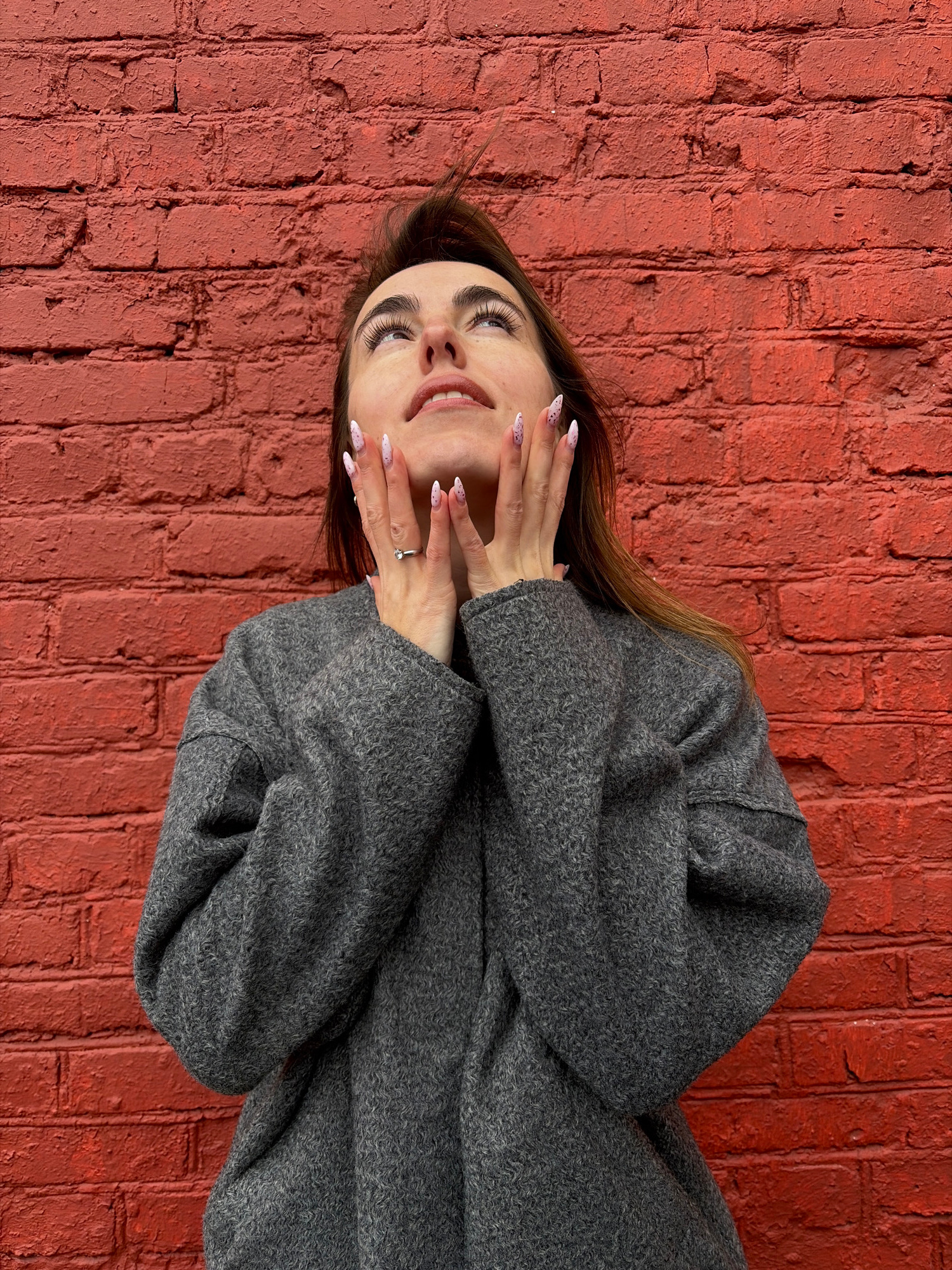 A woman with brown hair and manicured nails is lying on a red brick wall. She is wearing a gray coat and has her hands near her face. A ring is visible on her finger. The location is potentially Izhev…read more