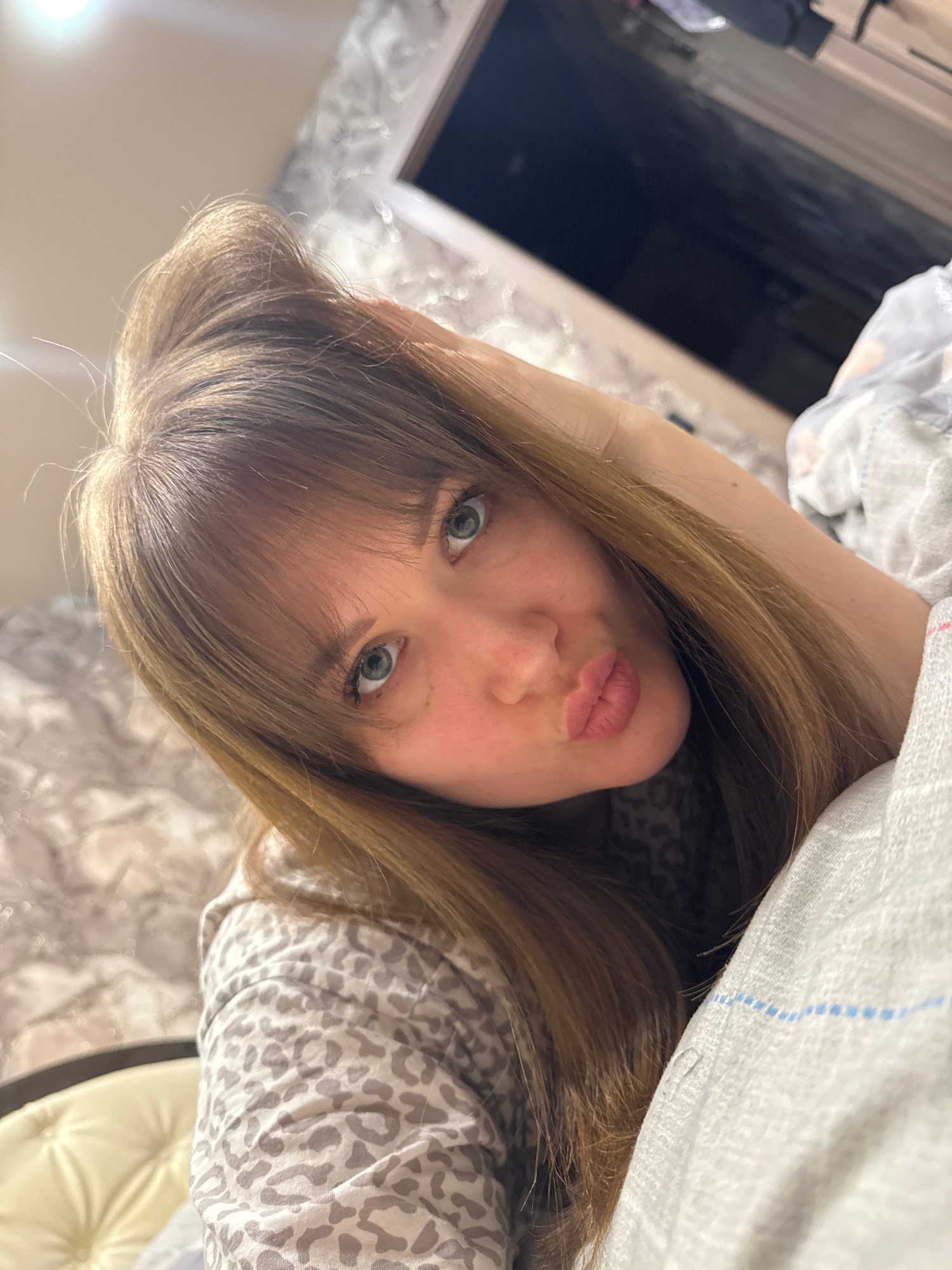 An indoor selfie features a young woman with light brown hair and light-colored, possibly blue or green, eyes. The image is oriented with the subject appearing on her side, rotated counter-clockwise.…read more