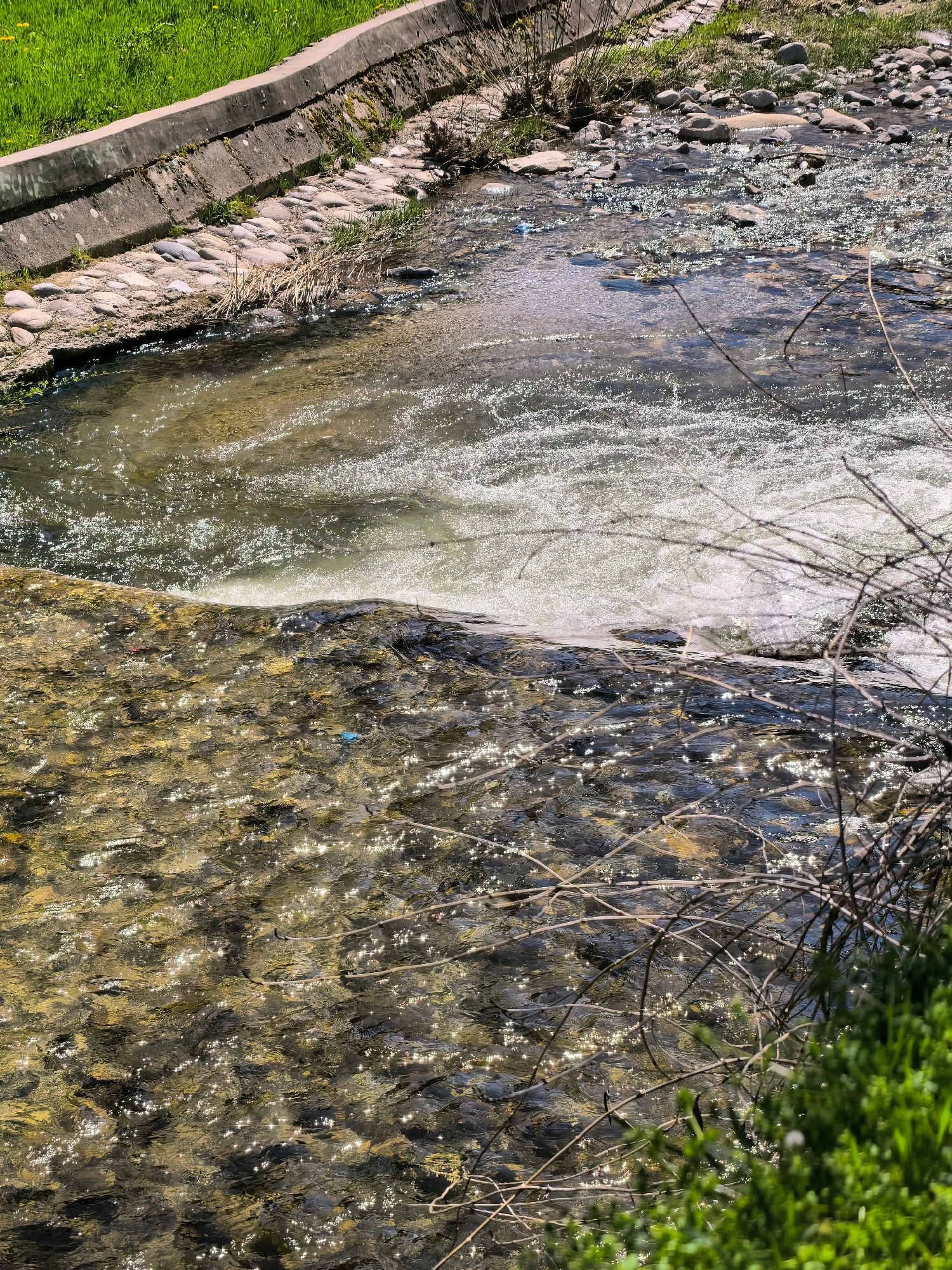 The image depicts a shallow, clear stream flowing through an urban environment. The water is partially reflective, with sunlight creating sparkling highlights on the surface. In the upper left of the…read more