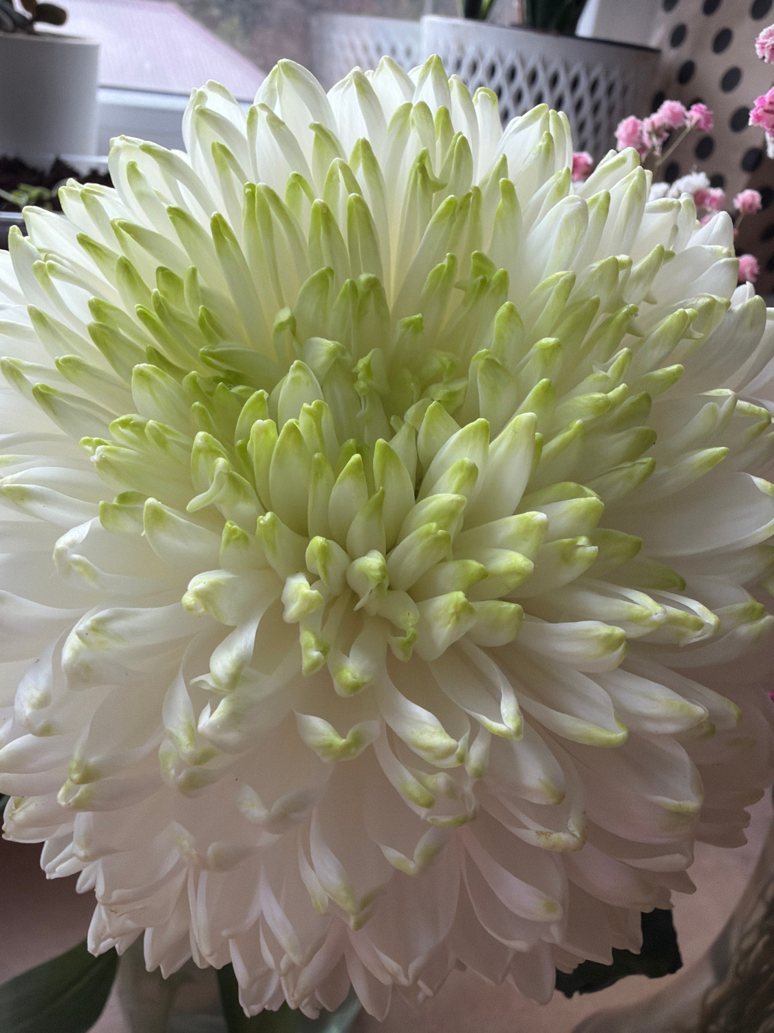 A large, vibrant chrysanthemum flower dominates the frame, captured in a close-up, top-down perspective. The flower features densely packed petals that transition from pristine white to a delicate, li…read more