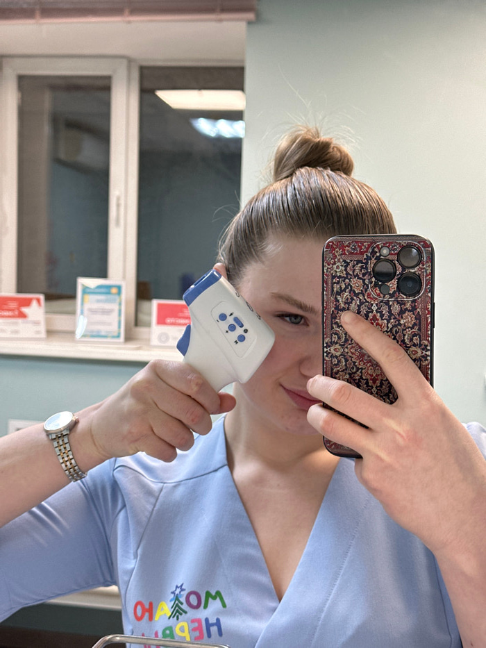 A woman in a light blue top takes a selfie with a non-contact thermometer held to her forehead. Her hair is pulled back in a bun. She holds a phone with a patterned case in her left hand. A window and…read more