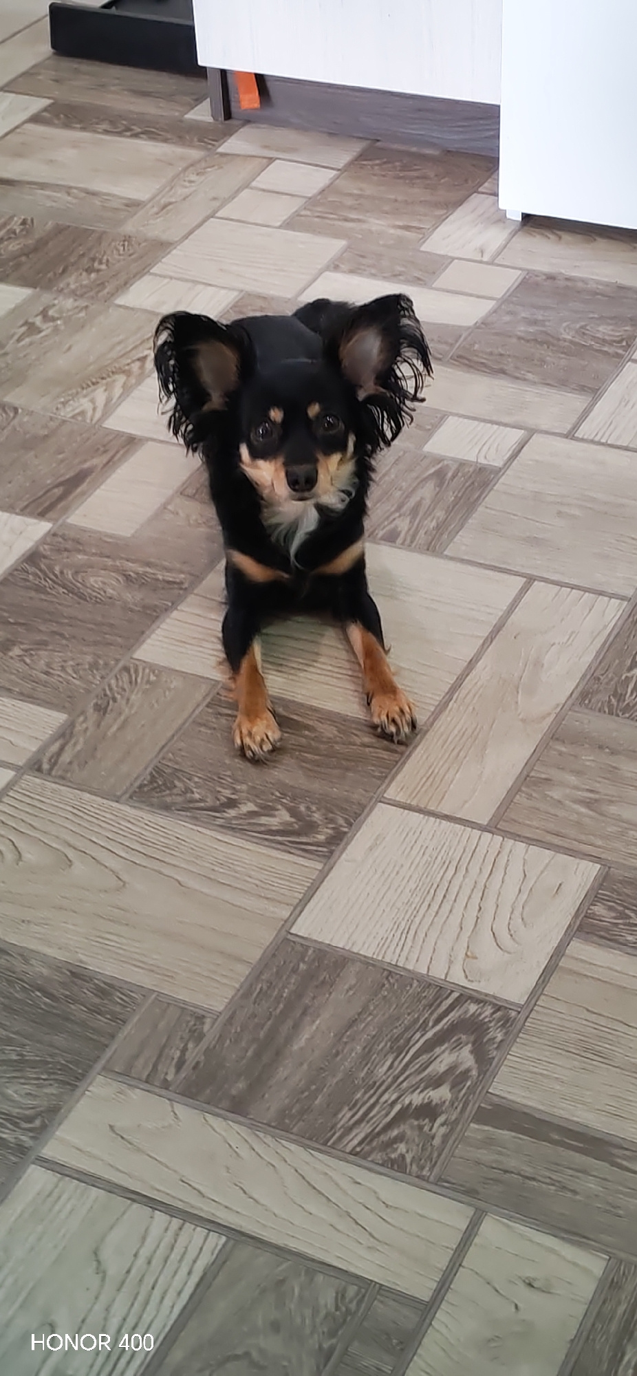 A small, black and tan dog with erect ears sits on a patterned tile floor. The floor is composed of alternating light and dark faux wood tiles, laid in a rectangular pattern. The dog is positioned nea…read more