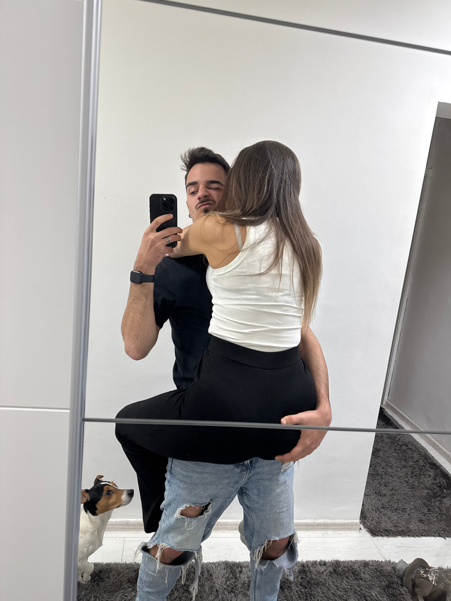 This image captures a joyful mirror selfie of a couple and their dog in what appears to be a home in Sofia, Bulgaria. The man, positioned on the left, holds a black iPhone with his right hand to take…read more